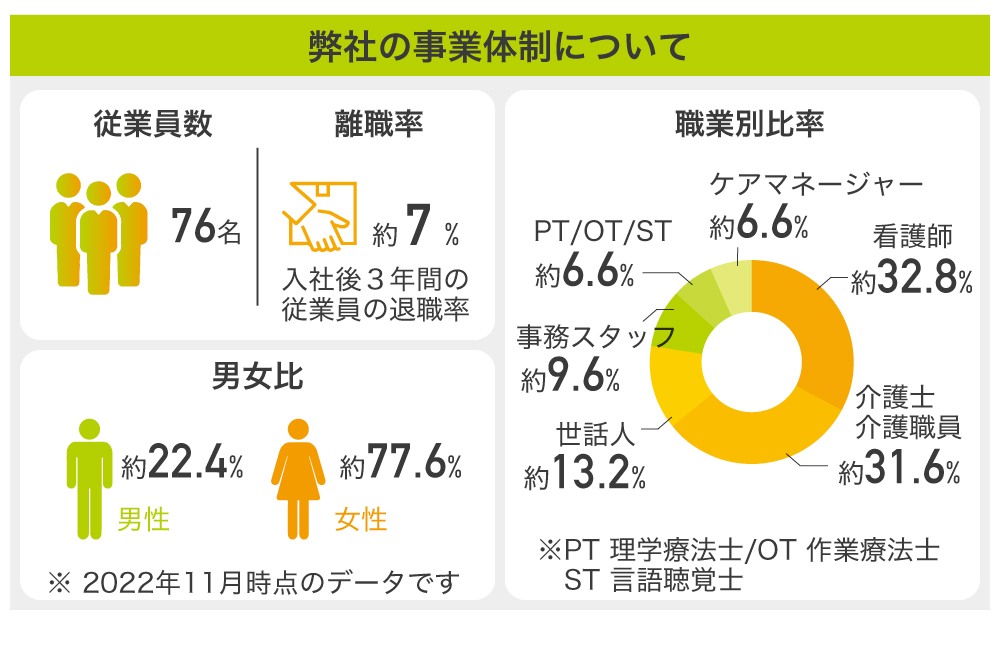 また、社員教育や福利厚生が後回しにされがちな介護業界において、弊社では人材育成を重要視しています。「従業員満足なくして、顧客満足は得られず」を掲げ、キャリアアップに関する独自のロードマップの策定や、女性が働きやすい環境を構築するなど、思考を凝らしています。