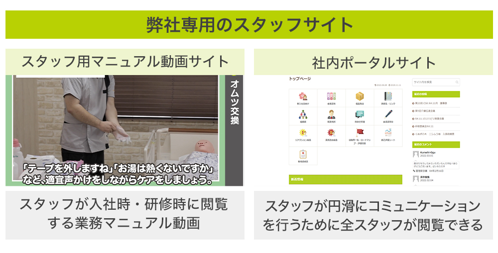 その他にも、スタッフのサービスクオリティを統一するためのサービスマニュアルを掲載した動画サイトや、情報交換用の社員用ポータルサイトも活用しています。