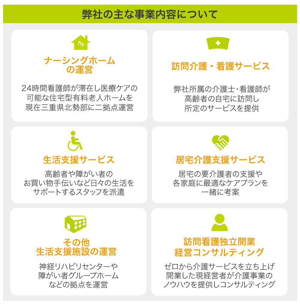現在は、ナーシングホーム(看護師による医療提供や看取りを行う老人ホーム)を2棟、訪問介護・看護ステーション、高齢者生活支援、居宅介護支援サービスの他、障がい者グループホームやリハビリ施設など7拠点を運営する他、訪問看護の立ち上げやナーシングホームの運営に特化したコンサルタントなども実施しています。