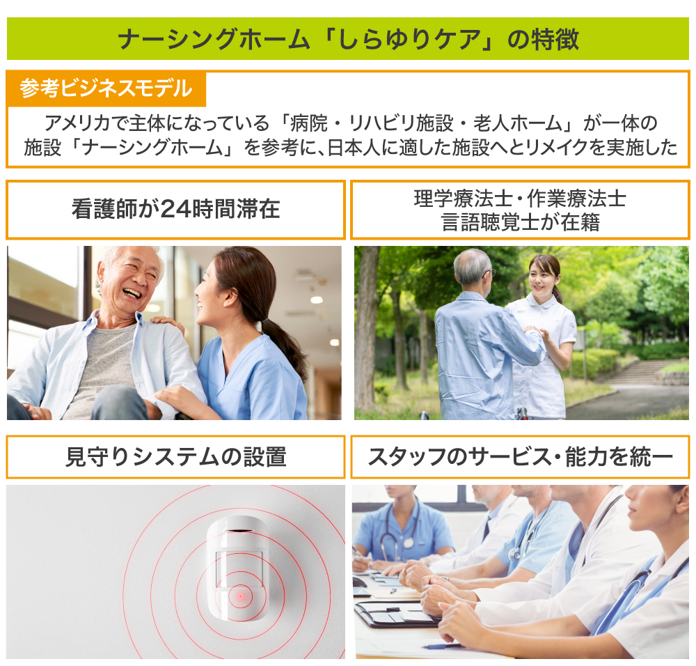 中でも、弊社の中核でもあるナーシングホーム「しらゆりケア」は、先進国であるアメリカの老人福祉施設の仕組みを日本流にアレンジして採用したことで、24時間体制で、医師の指示のもと看護師が医療行為(相対的医行為)を行える仕組みや、センサーを活用した自動見守りシステムなどテクノロジーを活用した運営体制を整えています。