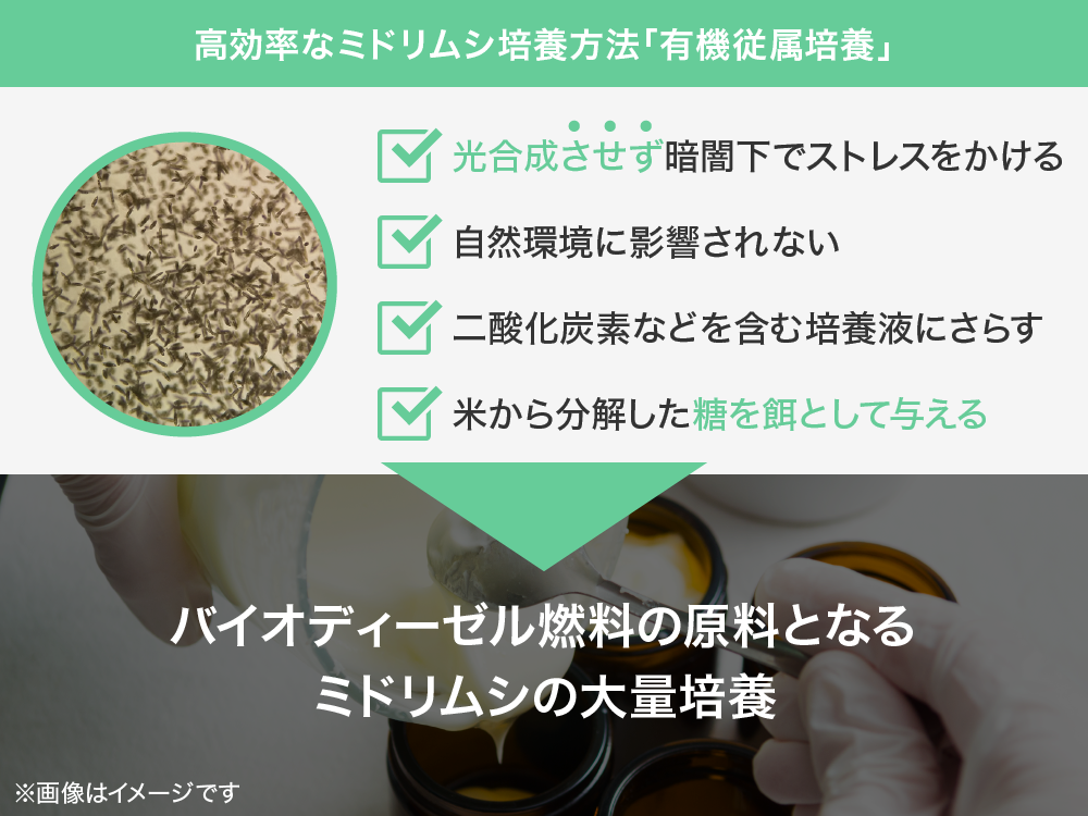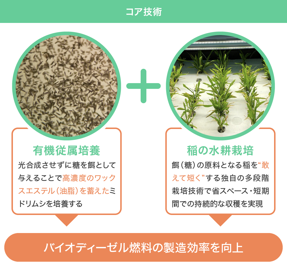 こうした中、弊社はミドリムシを使ったバイオディーゼル燃料の普及によるCO2削減を目指します。具体的には、有機従属培養による高効率なミドリムシ培養とそれを持続するための稲の水耕栽培技術を開発しています。