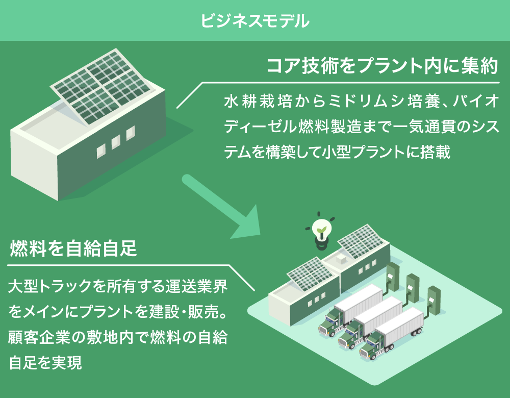 ミドリムシ(ユーグレナ)でバイオディーゼル燃料の製造は可能ですが、市場に流通していない事に疑問を抱き、大学等の研究者とコンタクトを取り、約2年の準備期間を経て設立しました。