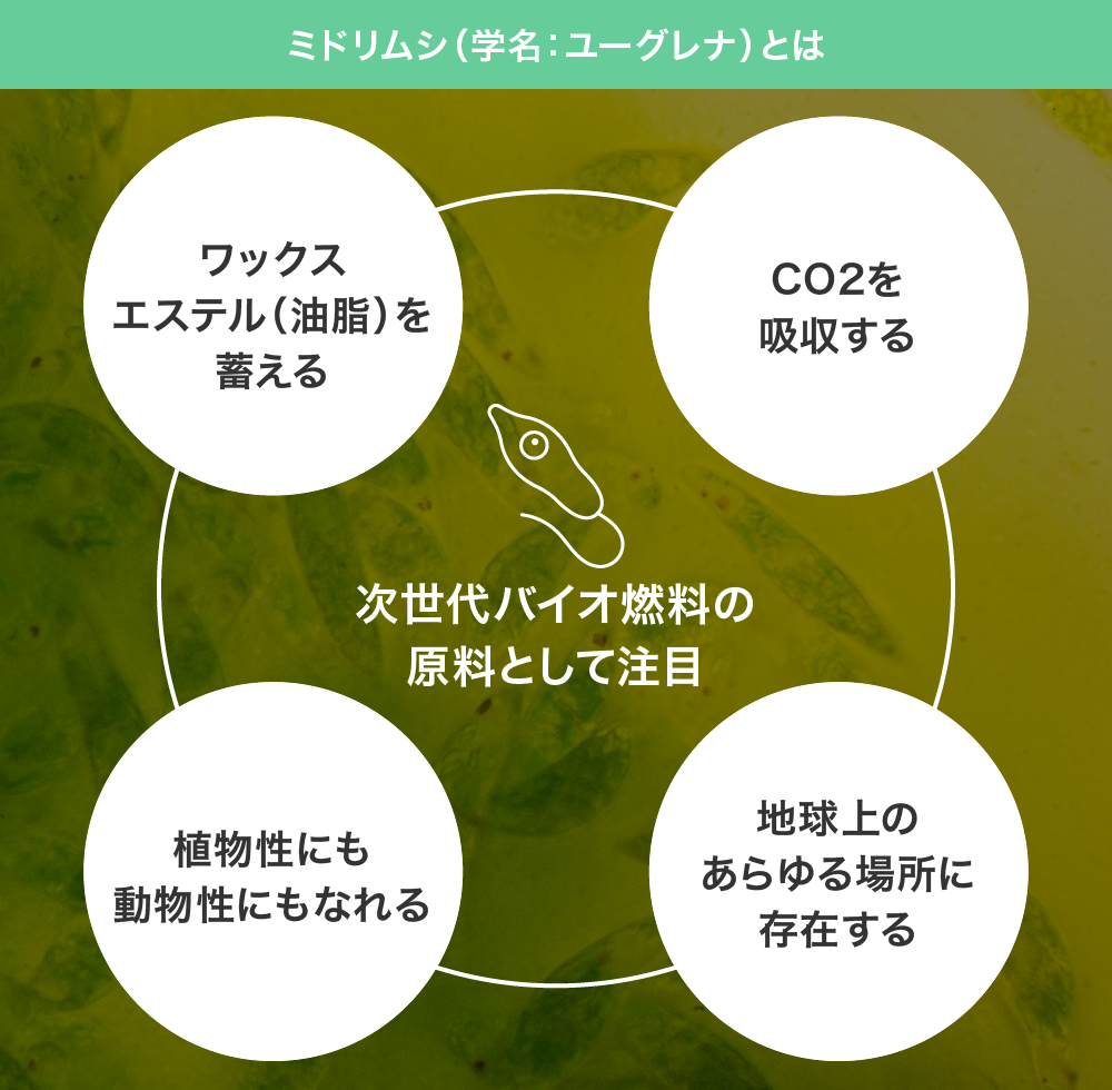 弊社は、ミドリムシ(ユーグレナ)由来の次世代バイオディーゼル燃料の製造によって環境問題の解決を目指すベンチャー企業です。