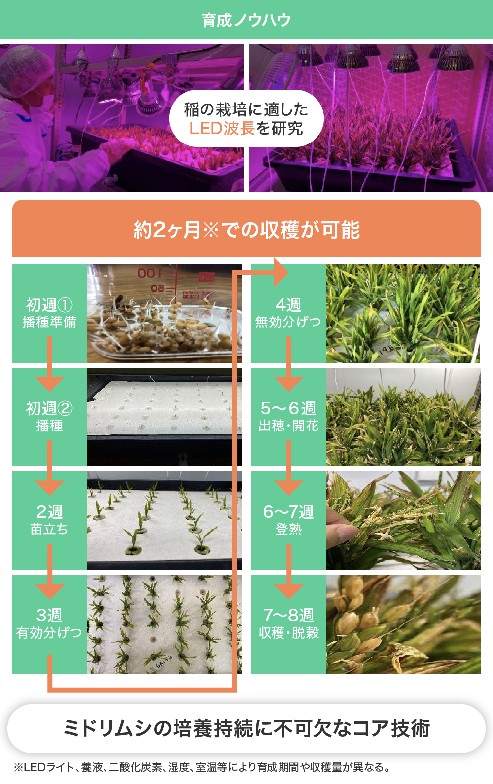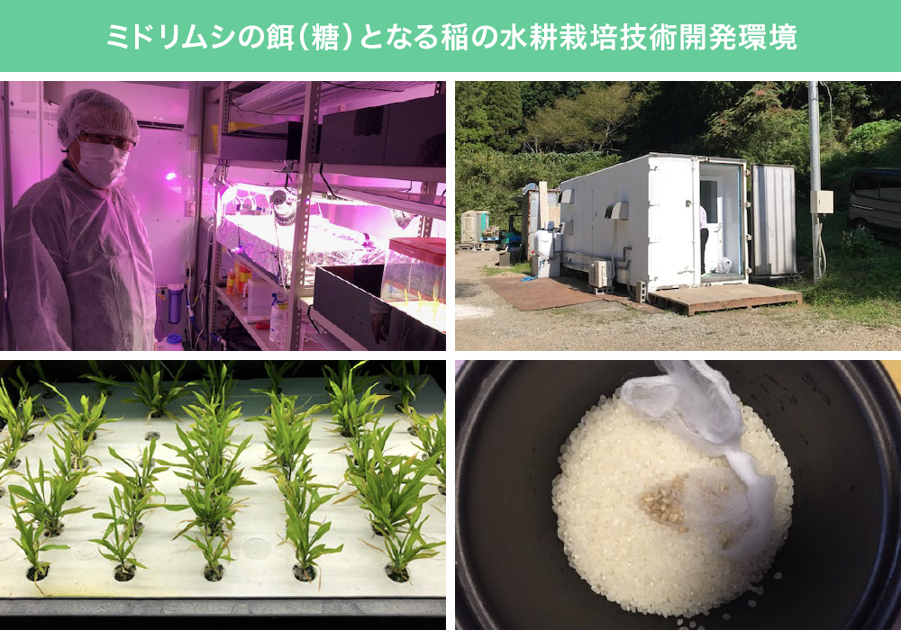有機従属培養を確立・継続するにはミドリムシの餌を安定確保しなければなりません。そこで弊社は、餌の原料となるお米を短期間かつ低コストで育てる独自の無農薬水耕栽培技術を開発しました。