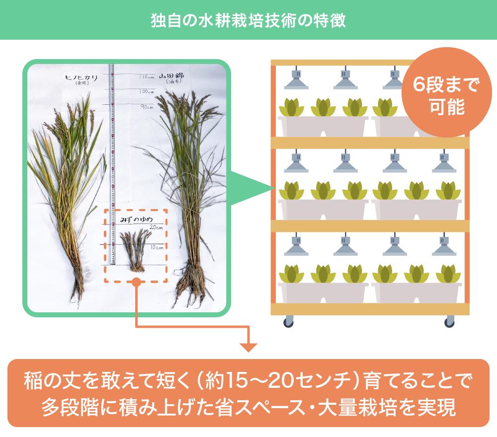 当技術最大の特徴は稲の背丈が低いことです。背丈を約20センチ以内にコントロールすることで、多段階に積み上げることができますので、省スペースでも大量に育てることが可能になります。