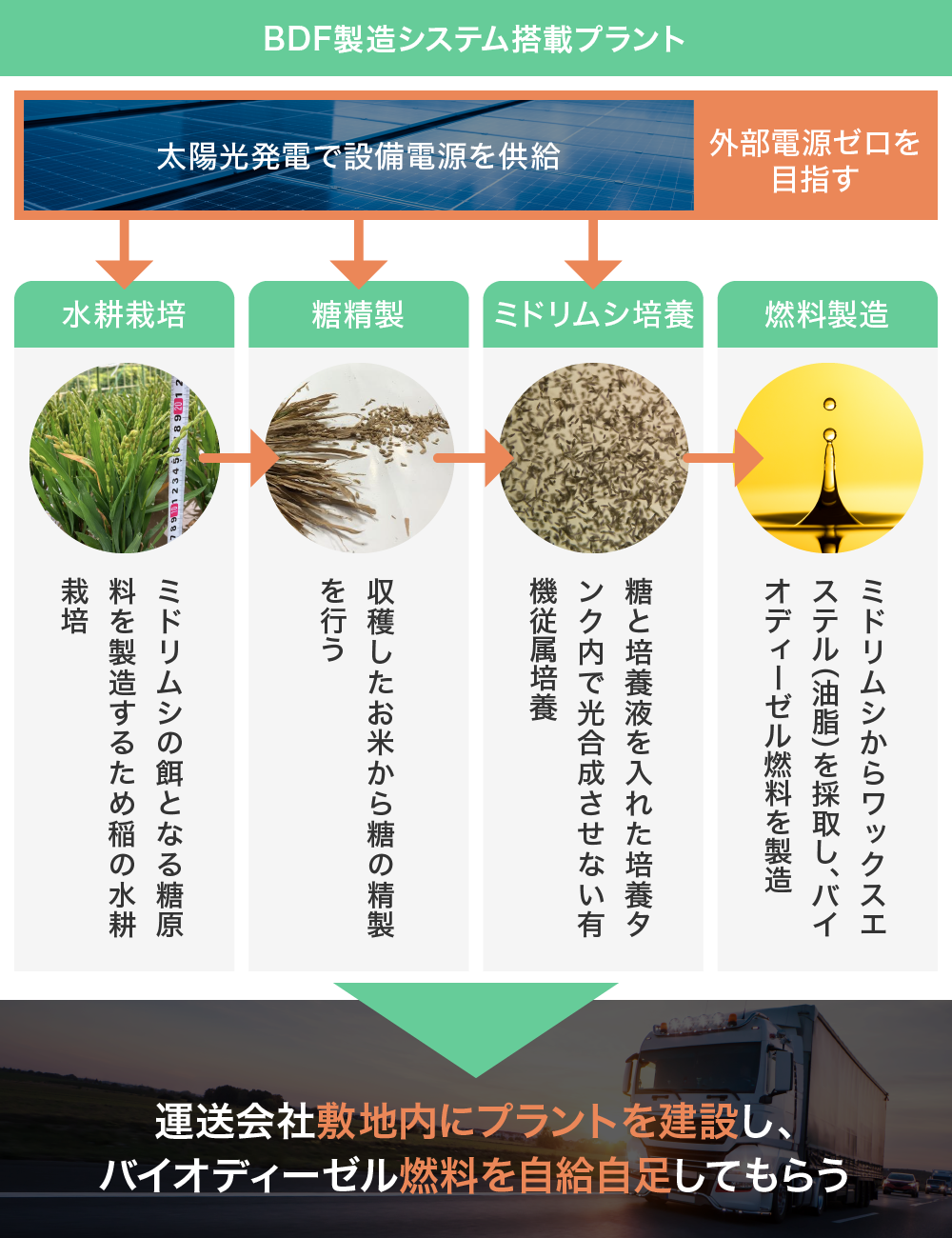 弊社は、光合成を行わずにミドリムシを育てる有機従属培養技術とLEDによる稲の水耕栽培技術を組み合わせた「BDF製造システム」を確立し、そのノウハウを搭載した小型プラントを運送業界各社に販売していく計画です。