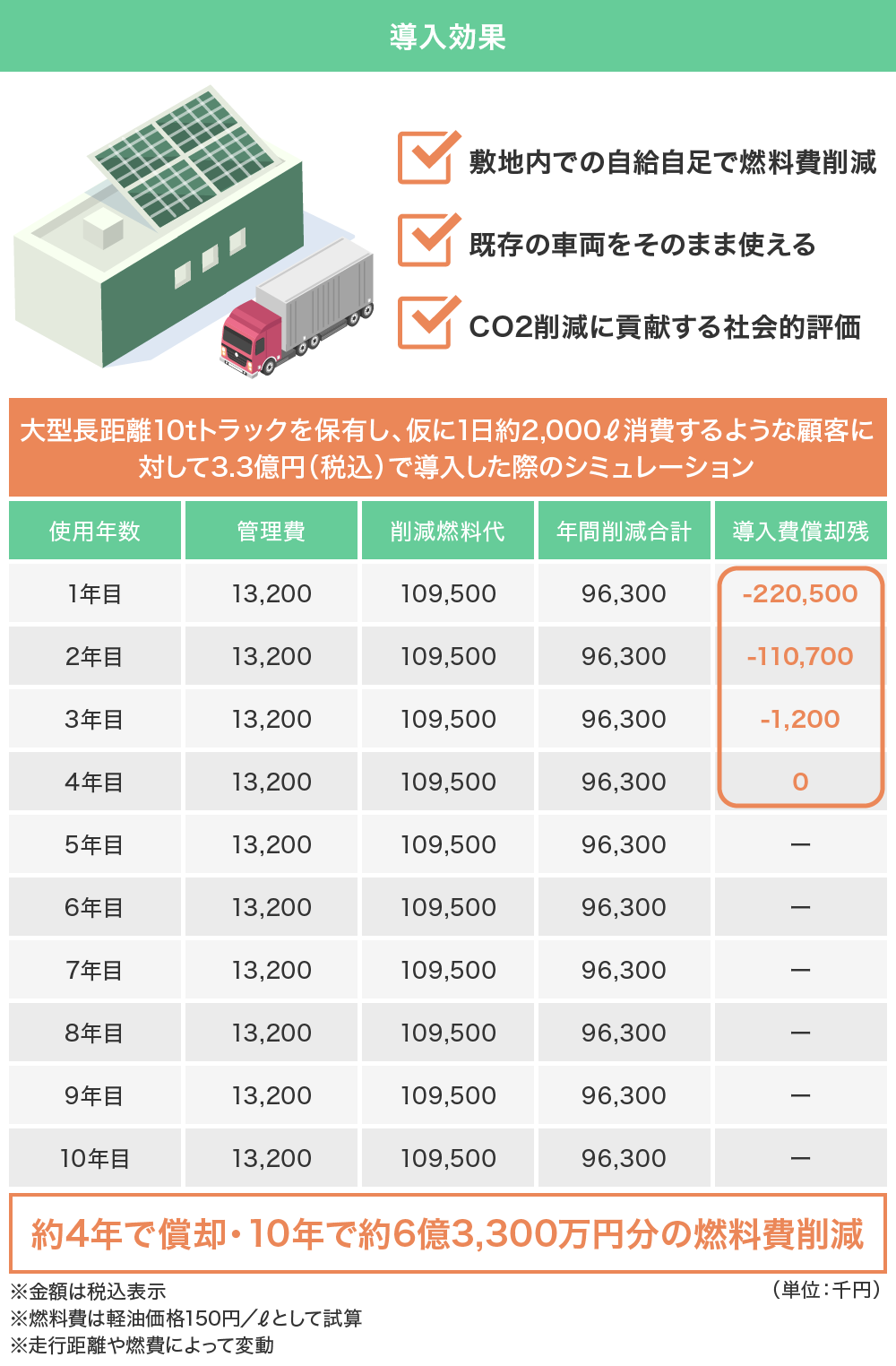 2023年にかけてテストプラントを通じた「BDF製造システム」の生産能力に関する検証を実施していきますが、プラント導入にあたっての企業メリットとして、例えば、1日2,000リットル軽油を消費する企業には、4年で償却、10年間で約6億3,300万円の燃料費削減を提案していく計画です。また、顧客となる企業は自社でバイオディーゼル燃料を“自給自足”することになりますので、高い課税の軽油を使用している、とりわけ中小の運送会社にはインパクトのある要素だと考えています。