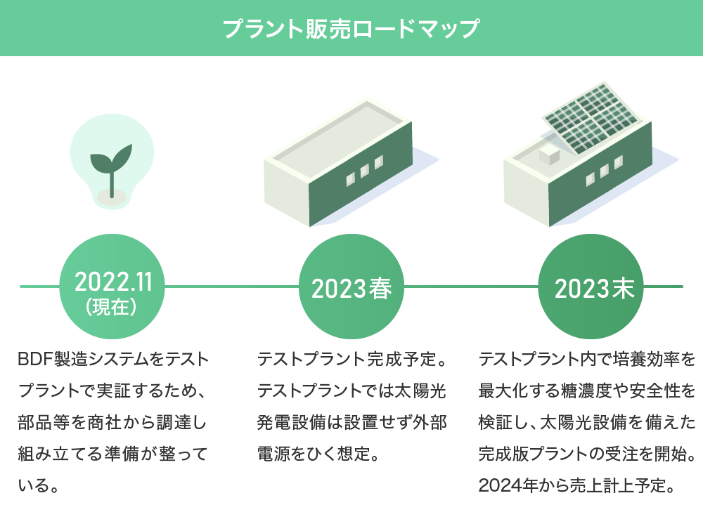 現在、技術的なノウハウは既に確立できており、これからテストプラントによる最終検証を実施していきます。培養効率の向上や安全性を検証したのち2023年末頃から受注を開始する計画です。