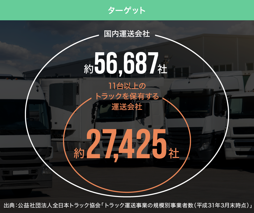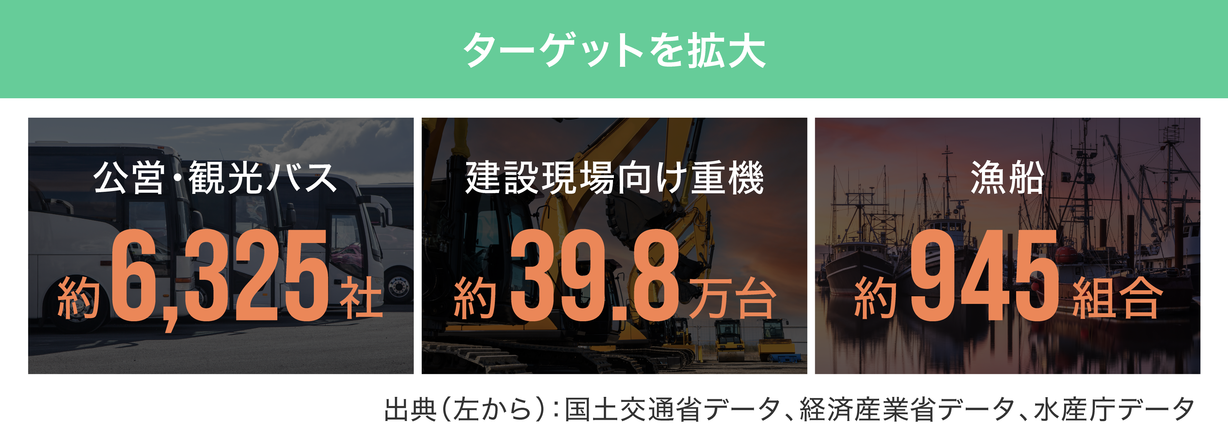 弊社はまずは運送会社での導入実績を積み上げ、ターゲットの拡大に注力していく計画です。公営バス会社や観光バス等を保有する民間企業、さらに建設重機を保有している大手ゼネコン、将来的には漁業組合にまで拡げていきたいと考えています。