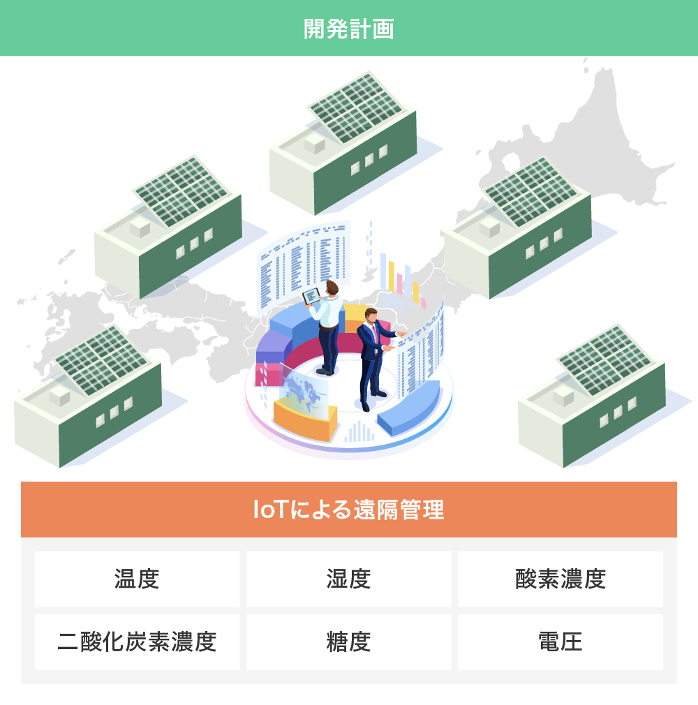 さらに、プラント各所にIoTセンサーやカメラを設置することで温度、湿度、酸素濃度、二酸化炭素濃度、糖度、電圧などを管理センターで遠隔操作できるようにしていきたいと考えています。また、各プラントは水耕栽培室やミドリムシ培養、乾燥室などを含め、全自動化を計画しています。