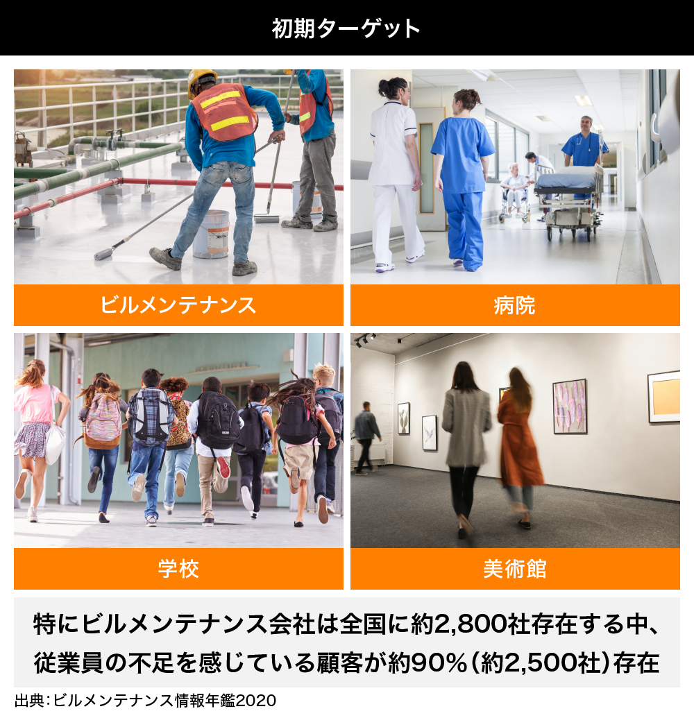 今年10月に開催されたビルメンテナンスに特化した展示会にてデモンストレーションをしたところ多くの商談依頼を受けており、ビルに限らず、病院や学校、ホテル、美術館、飲食店、マンションなど幅広いシーンへの導入を見込んでいます。