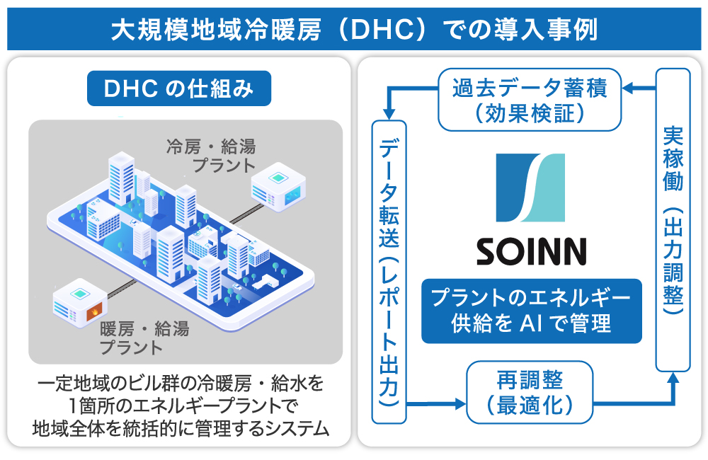 「SOINN® E-1(以下、E-1)」は、弊社が開発したショッピングモールや大規模地域冷暖房(一定地域内の多数の建物へ熱製造プラントから導管を通し、冷水や蒸気を供給して冷暖房・給湯などを行うシステム)で運用実績のある独自AIをモジュール化したもので、「E-1」機能を最大限活用した場合、平均 8~10% 程度のエネルギーコスト削減が見込めます。