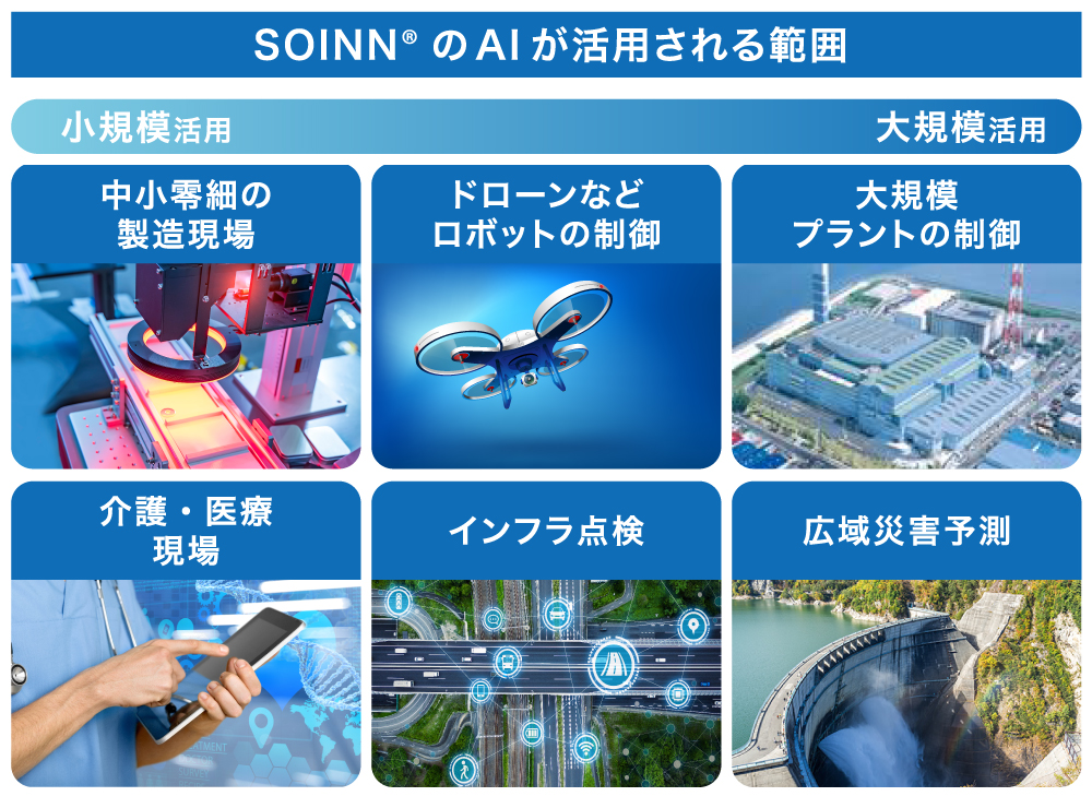 既存の「SOINN®」の技術に加え、既存の機械学習等の技術も組み合わせることによって、プラントやEMS(環境マネジメントシステム)などのシステムの最適化、ベテランの知見やスキルの継承による省人化など、様々なシーンにおいてビジネスレベルの運用実績があります。
