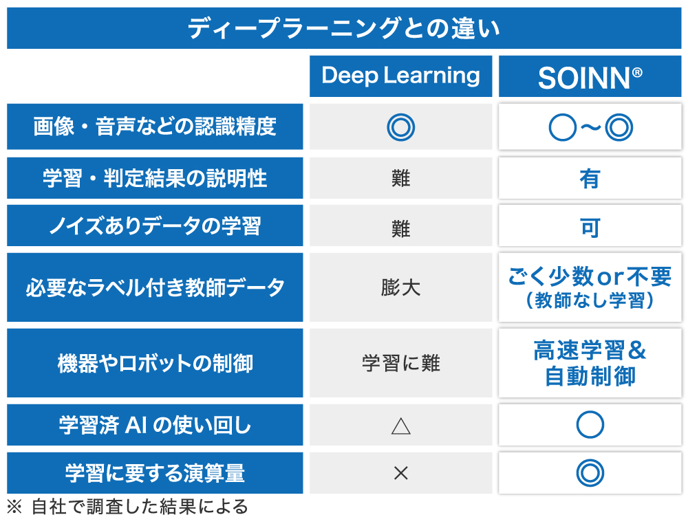 「SOINN®」は、現在AI 業界で主流のディープラーニングに比べ、非常に少ないデータと演算量で実用レベルの性能が得られます。