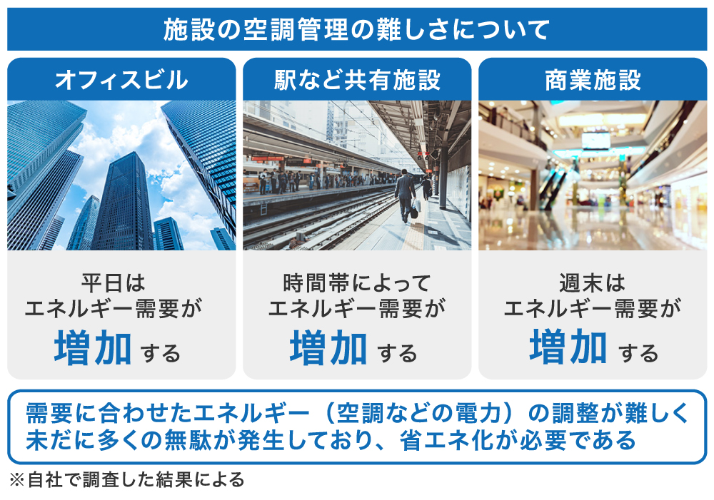 例えば、一般に夏の日中は気温が上昇し、エアコンが稼働して電力消費が増えますが、オフィスビルでは週末の電力消費は下がります。逆に商業ビルでは週末に人出が増え、エネルギーの消費も増えます。