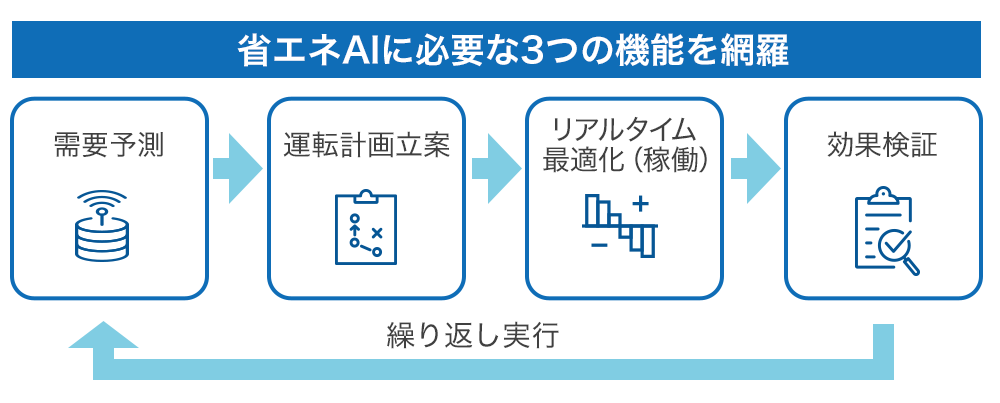 また関連機器が最大効率で稼働するよう、機器の運転の順列・組合せを決める「②運転計画」や、当日の天候の変化等に柔軟に対応させるための「③リアルタイム最適化」も非常に有効です。