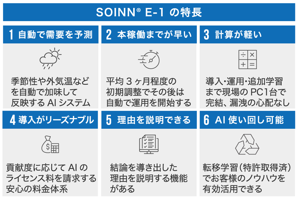 こうした社会的課題の解決に貢献すべく、弊社では2018年頃から独自の省エネ AI 「SOINN®(ソイン)E-1」の開発と導入を進めています。