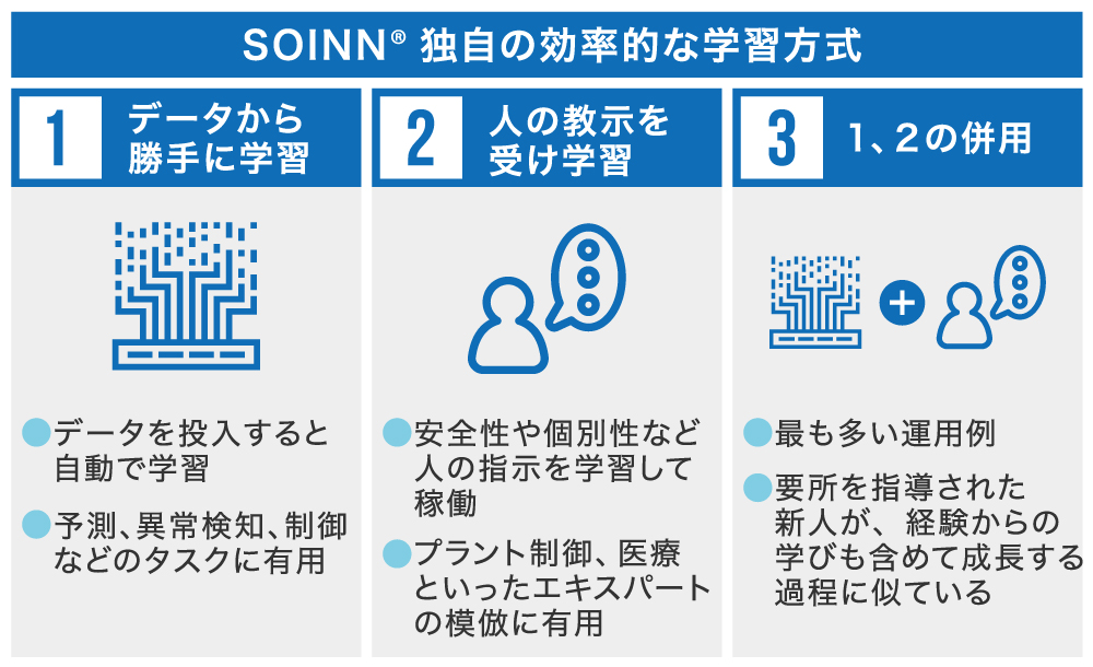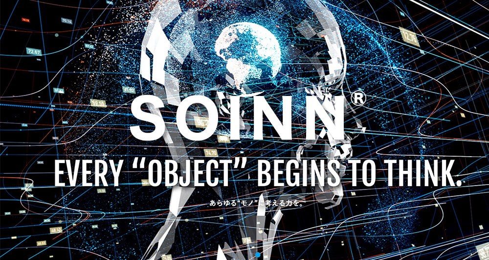 「SOINN®」は「Self-Organizing Incremental Neural Network」の略で、ディープラーニングが脳の視覚系(見る機能)をモデル化しているのに対し、「SOINN®」は脳の側頭葉(覚える機能)のモデル化となっており、私たちの何十年という人生の記憶が小さい脳の中に全て収まっているのに似て、覚えておくべき重要な事柄のみ、コンパクトに学習できる点に特色があります。