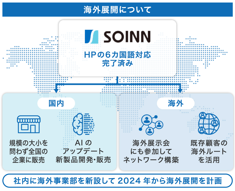 すでに国の貿易機関(JETRO:独立行政法人日本貿易振興機構)への相談や、ハイテク技術の輸出規制のリサーチといった準備を進めており、2024年頃から本格的な海外販売を開始する計画です。