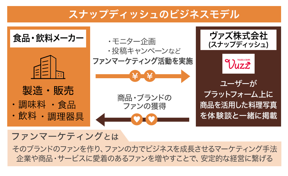 また、「スナップディッシュ」では、一般的な広告による収入ではなく、料理への関心が高いユーザーに向けて食品・飲料メーカーなどが商品のモニター企画や市場調査などのファンマーケティング活動によりマネタイズをしています。このビジネスモデルにより、「スナップディッシュ」ユーザーと食品・飲料メーカー間の関係性を高め、商品やブランドのファン増加を促進するものと考えています。