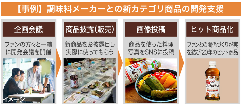 また、弊社は投稿内容を分析してマーケティング戦略を提案したり、ファンの方々とともに商品開発に参加したりすることもあります。近年では、ヤマサ醤油株式会社の「これ!うま!!つゆ」という商品の味付けから商品名、パッケージにいたるまでファンとともに商品開発を実施したことで、商品のヒット化に大きく貢献しました。