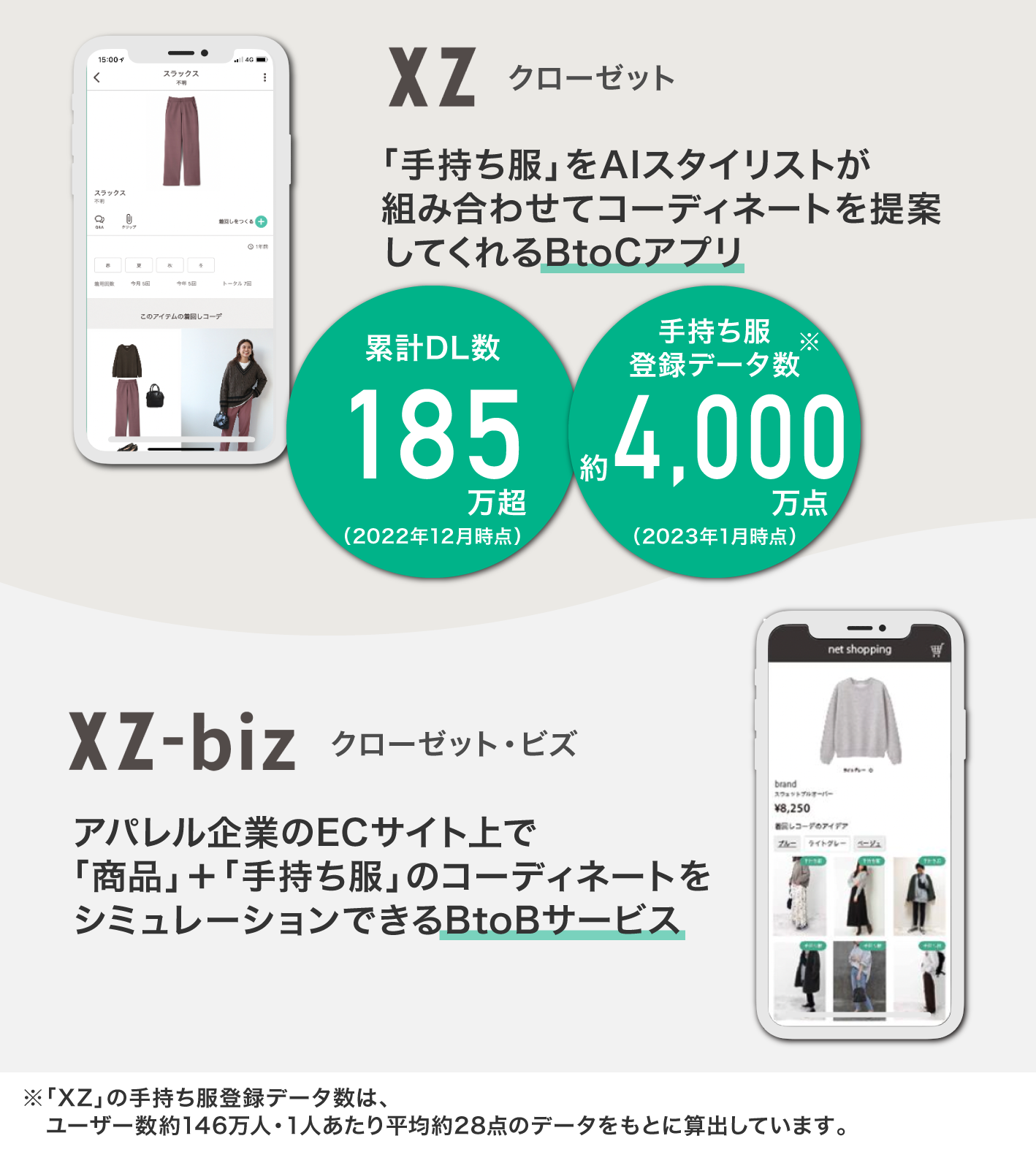 「XZ」アプリは、これまでに累計185万ダウンロードを突破(2022年12月時点)し、約4,000万点におよぶファッションアイテム(手持ち服=私服)のデータが登録されています(2023年1月時点)。