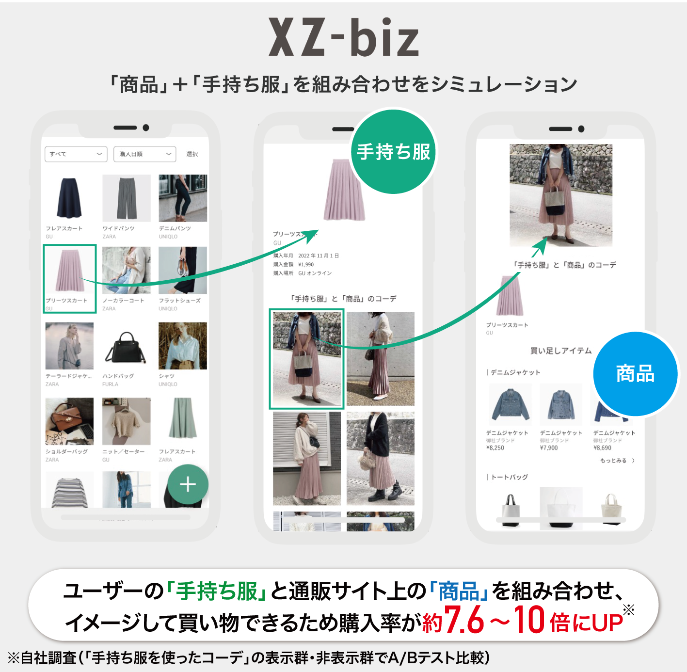 一方、「XZ-biz」は、「XZ」の仕組み・エンジンを切り出して活用し、アパレル企業の通販サイト上で「商品」+「手持ち服」を組み合わせたイメージをシミュレーションできるサービスです。
