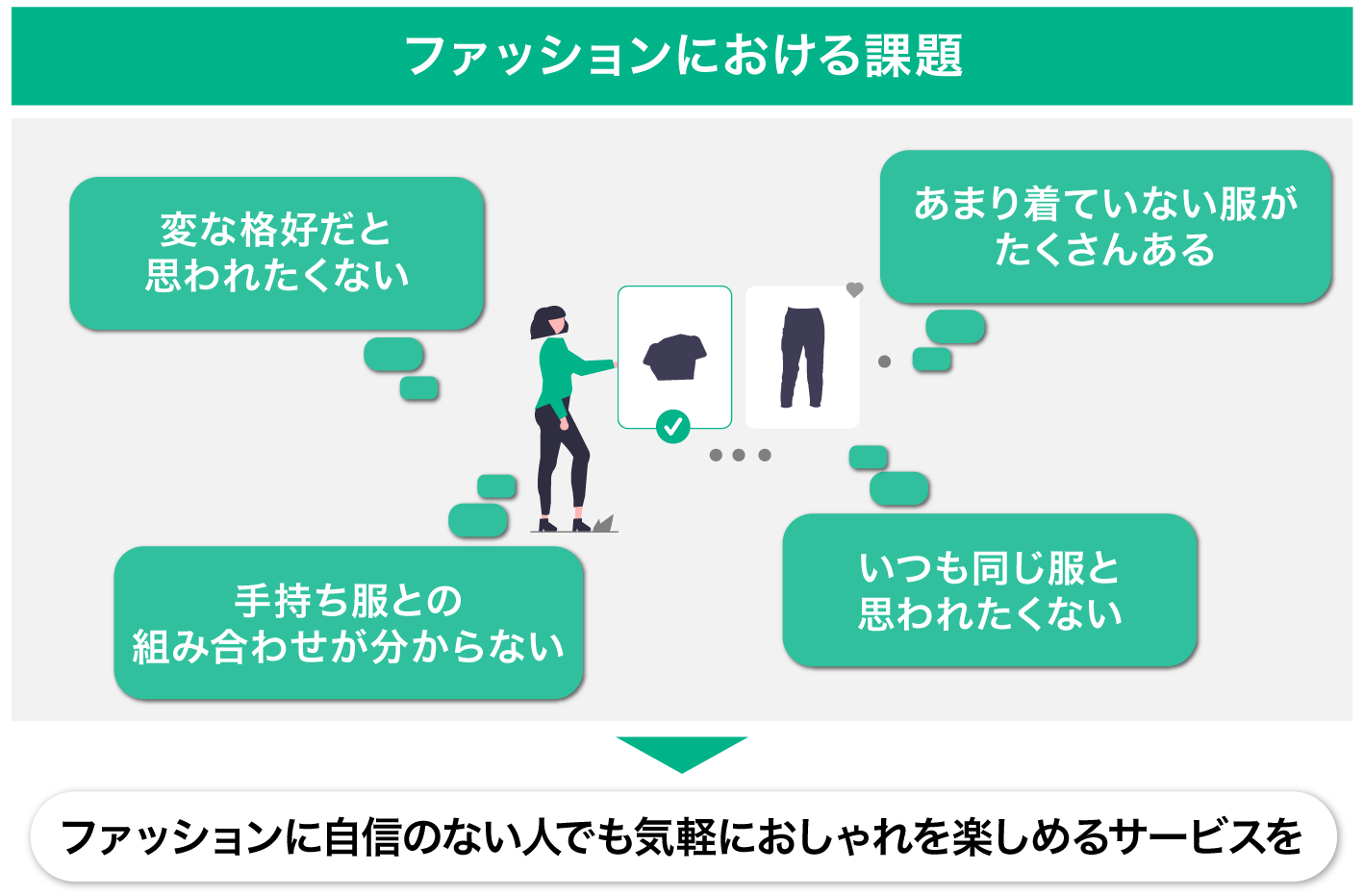 そこで弊社は、ファッションセンスに自信のない人でも、気軽におしゃれを楽しめるサービスがあれば良いのではないかと考えました。