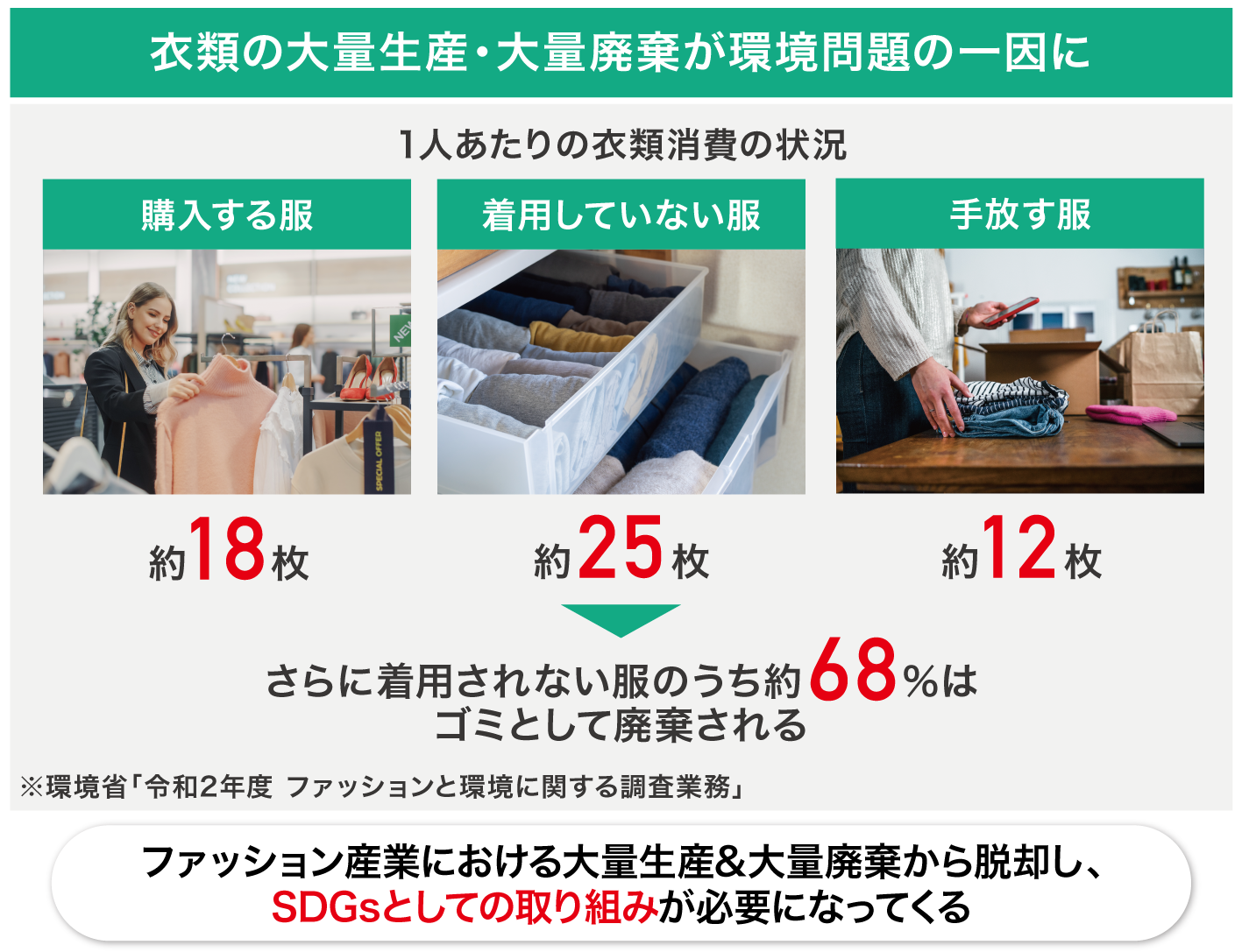 環境省の調査では、日本人は「1年間に一度も着ていない服」を1人あたり平均25枚も所持しており、さらに、着用されない服のうち約68%は、リユースや再利用されることなくゴミとして廃棄されているとしています。また、国内だけでも年間約100万tもの衣類が大量廃棄されています(出典:独立行政法人 中小企業基盤整備機構)。