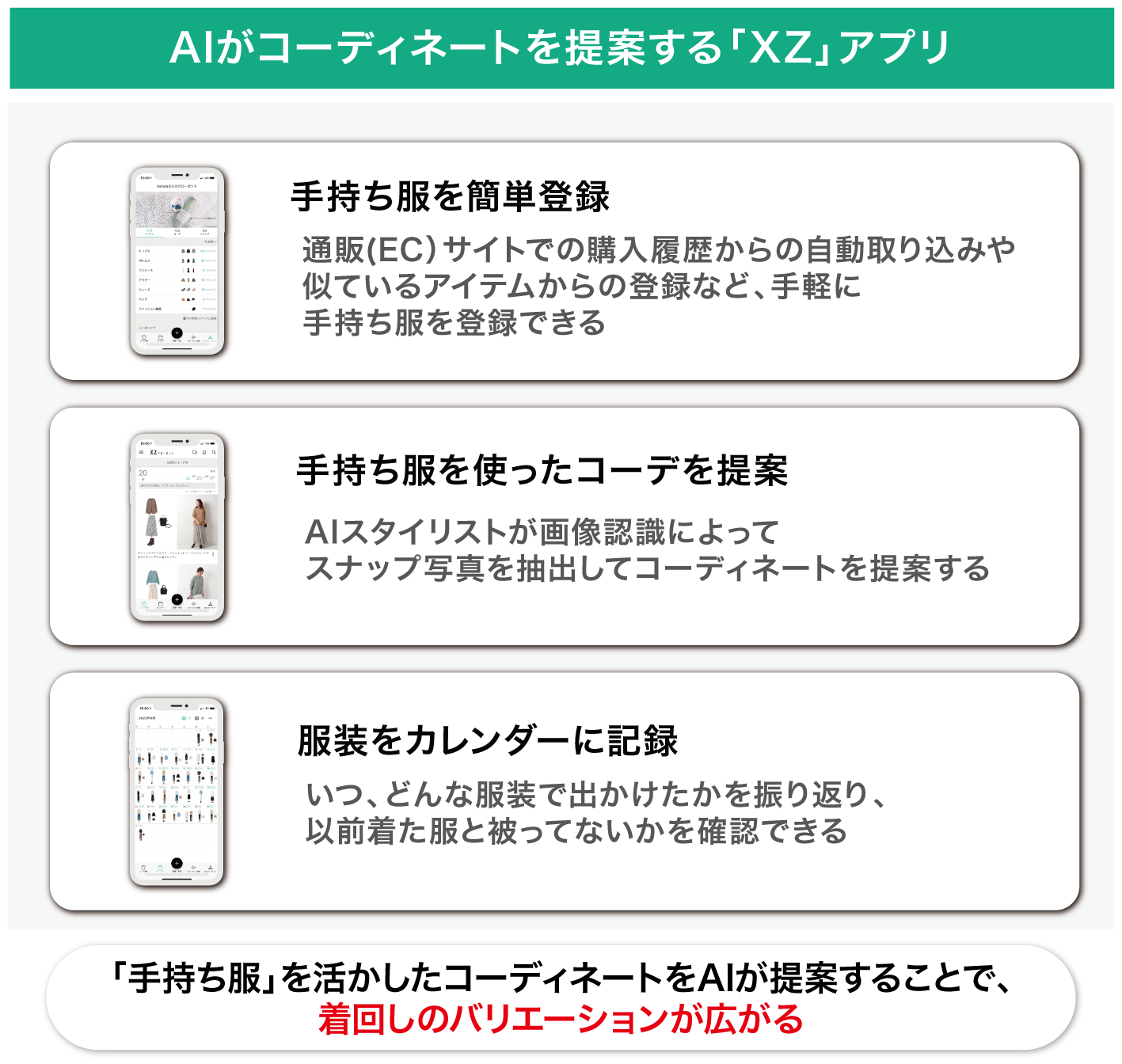 ユーザーは簡単な操作で「XZ」に手持ちの服を登録でき、持っている服を組み合わせて実現できるコーディネートのイメージを、気温や天気に合わせてAIが提案してくれます。