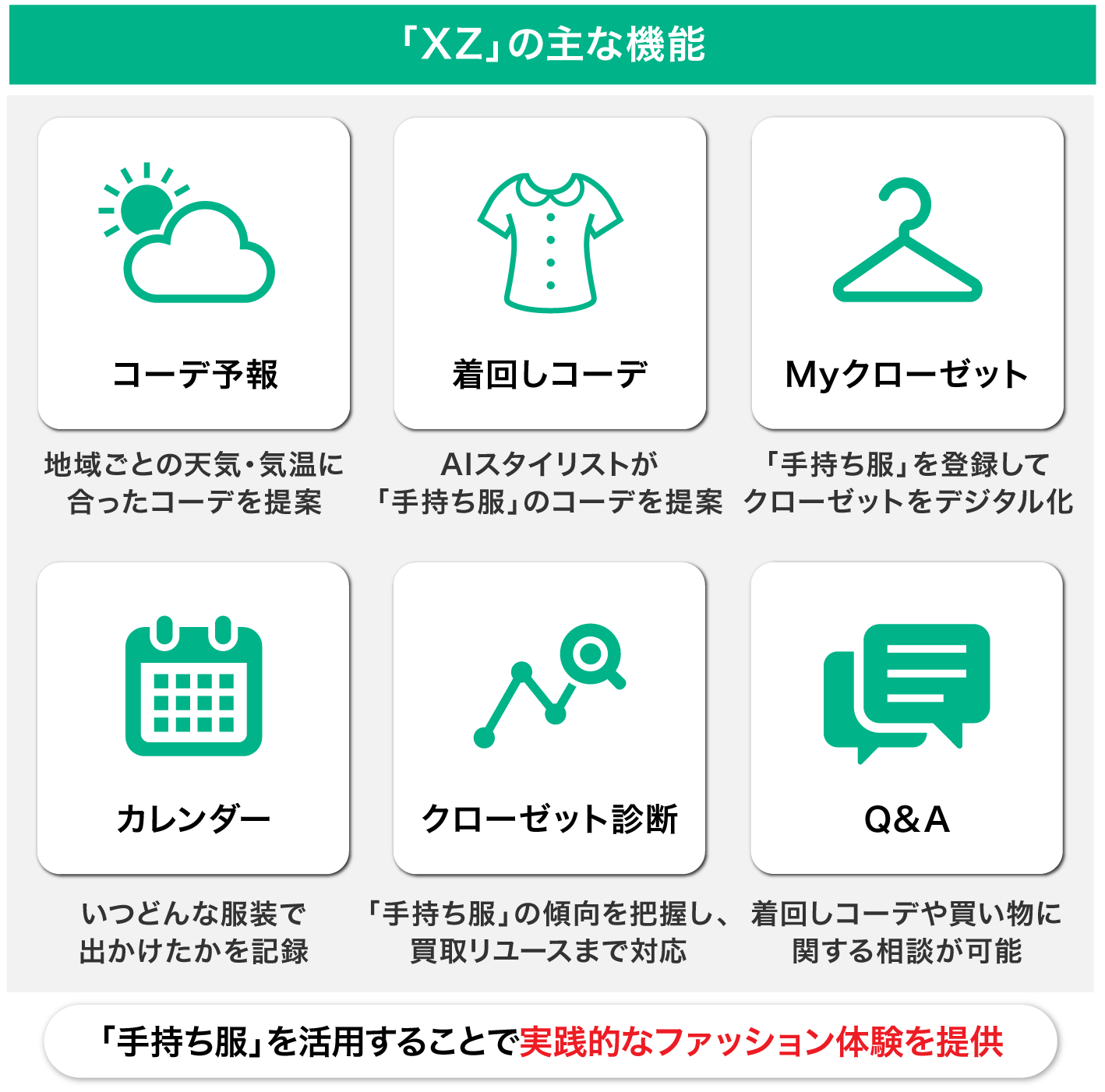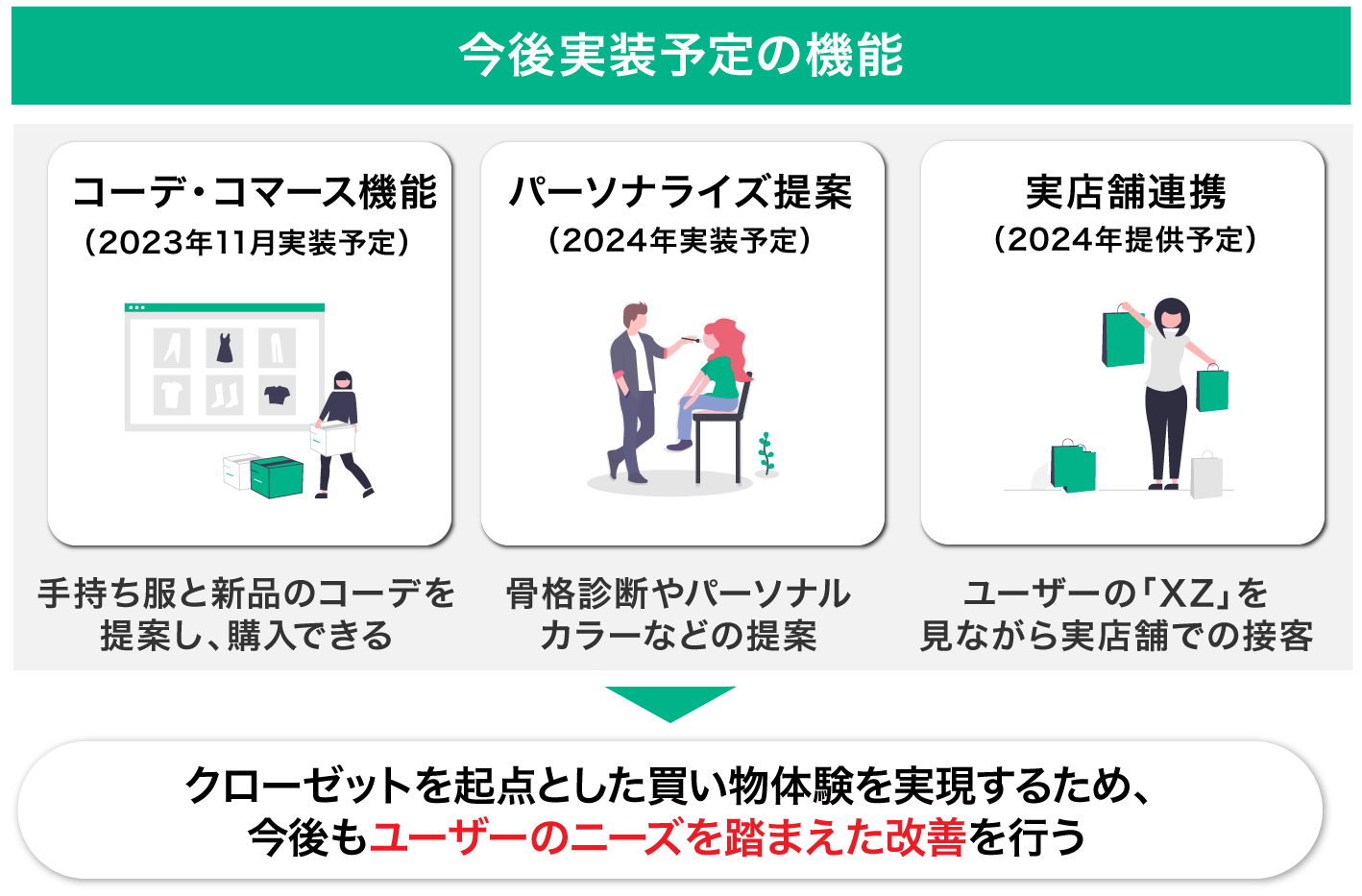 一方「XZ」では、「手持ち服」に合う「新品商品」をプラスオンしてコーデ提案することで、必要なアイテムを無駄買いせずに買い足せるようになるコマース機能をリリースする予定です。