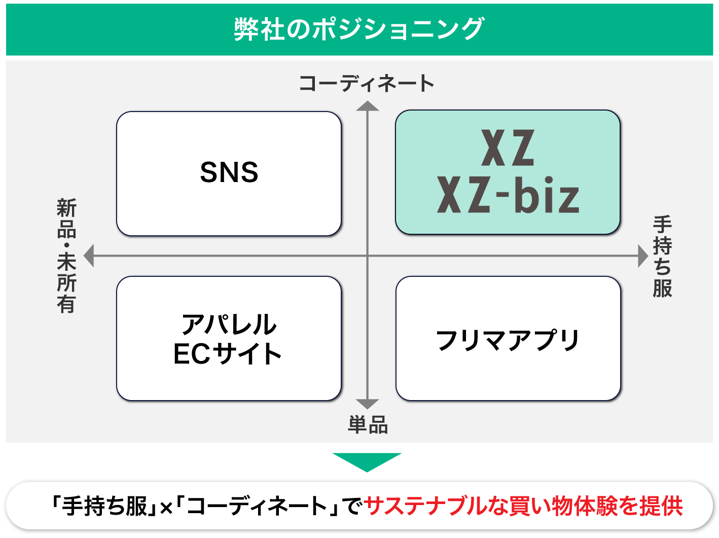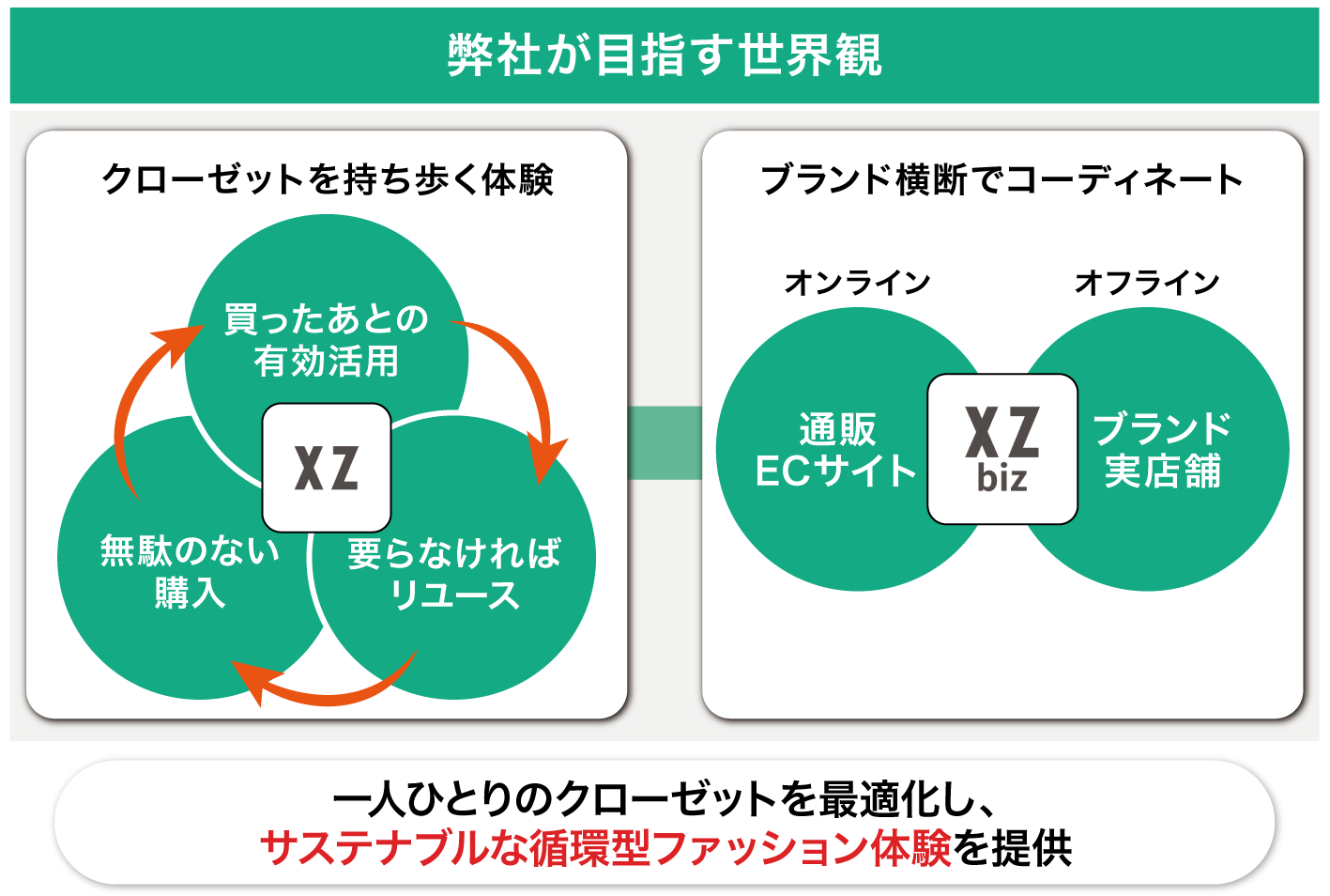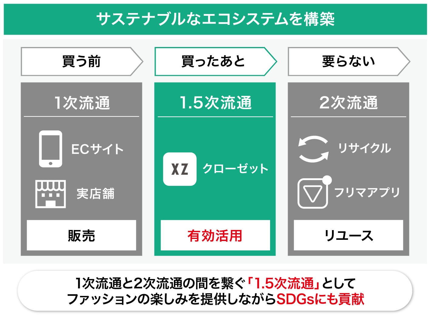 弊社の立ち位置は、従来の1次流通と2次流通の間を繋ぐ「1.5次流通」の担い手です。XZサービスでは、1次流通で購入したままタンスの肥やしになっていたアイテムの再活用を促し、それでも不要ならば2次流通によるリユースを促します。