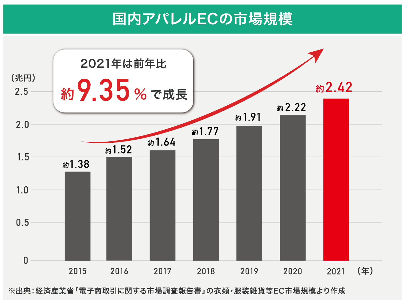 2021年の国内アパレルECの市場規模は、約2兆4,279億円、前年比伸び率は約9.35%と順調に成長しています。