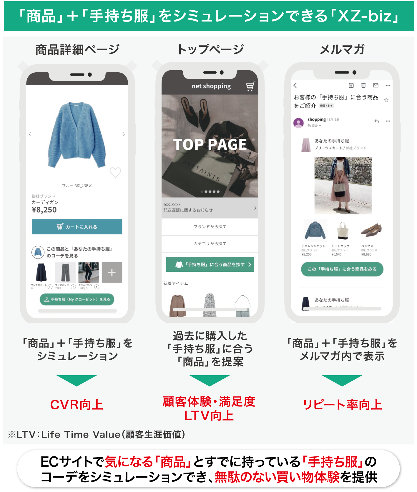 弊社が開発した「XZ」および「XZ-biz」は、「手持ちの服×コーディネートの提案」でタンスの肥やしの活用を促すというのがユニークな特徴となっています。衝動買いを促す短期的な成果ではなく、魅力的な買い物体験により中長期的なエンゲージメント(企業やブランドと消費者との強い関係)形成やLTV(顧客生涯価値)向上を目指しています。