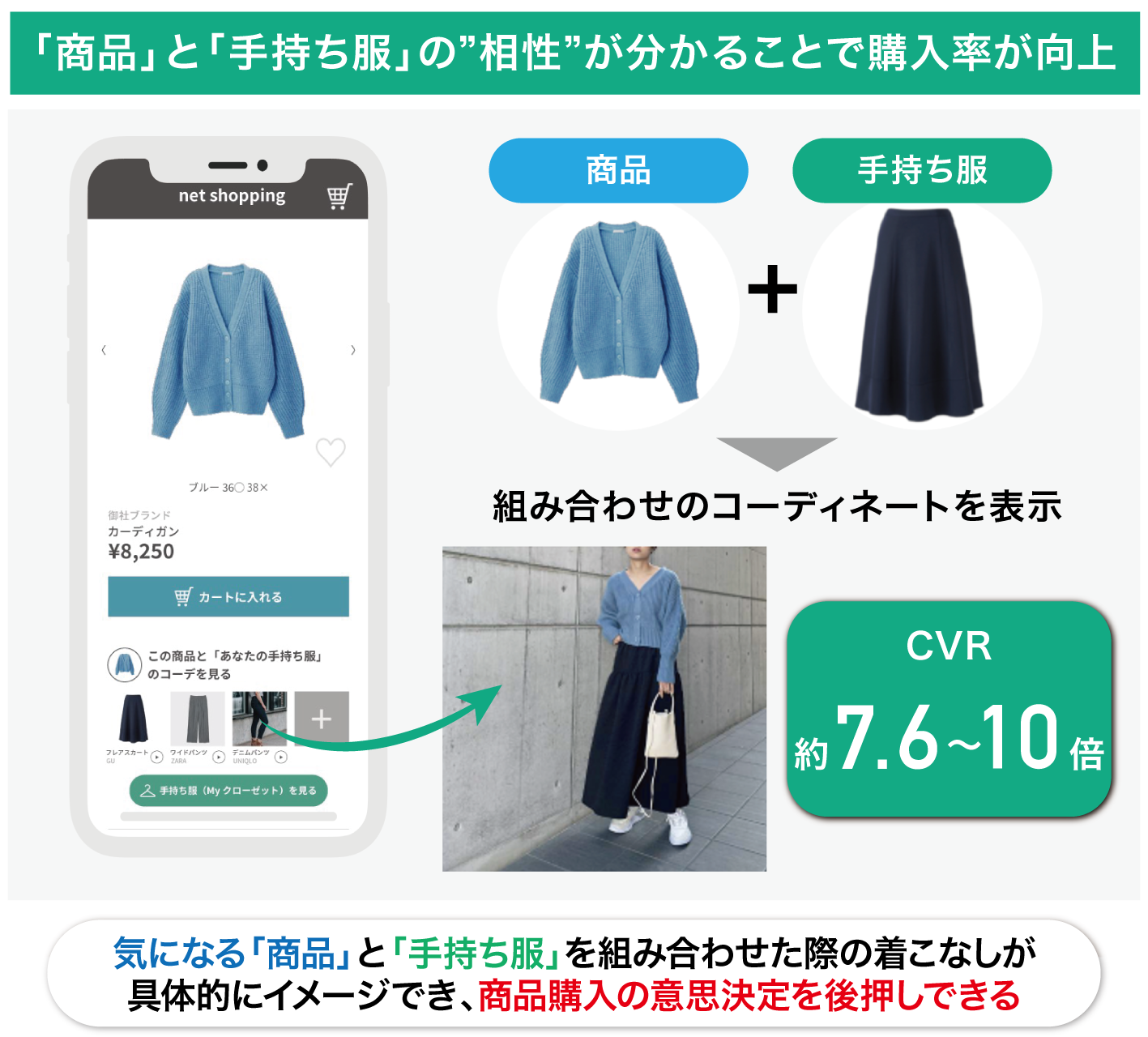 ユーザーが購入済みの「手持ち服」と「商品」の組み合わせたコーデ提案を表示させた場合は、弊社調査によるとCVR(購入率)が約7.6〜最大10倍となっており、持っている服と組み合わせた際の着こなしが具体的にイメージできることで、商品の購入の意思決定を強く後押しできると考えています。