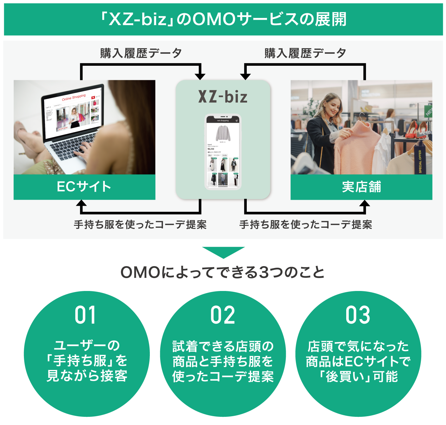 現在「XZ-biz」はECサイト上のみで展開していますが、中期的にはブランドの実店舗と連携し、お店でもAIによるコーデ提案が受けられたり、実店舗で購入した商品がECサイトでの提案に反映されたりといった、「OMO(Online Merges with Offline:オンラインとオフラインの融合)サービス」として展開していく予定です。