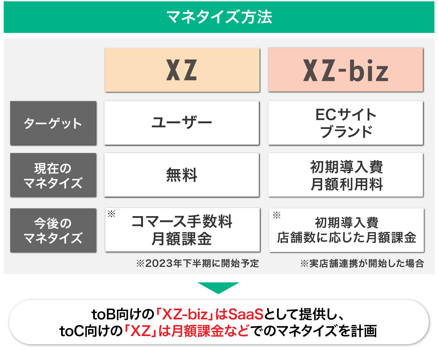 一方「XZ-biz」は、初期導入費と月額利用料のSaaSとして提供していきます。ECサイト向けには、シミュレーション(タップ)数に応じて金額が決まる形態ですが、「XZ-biz」の実店舗向けサービスが開始した際は、ブランドごとの初期費用+導入店舗数に応じた月額料金とする予定です。