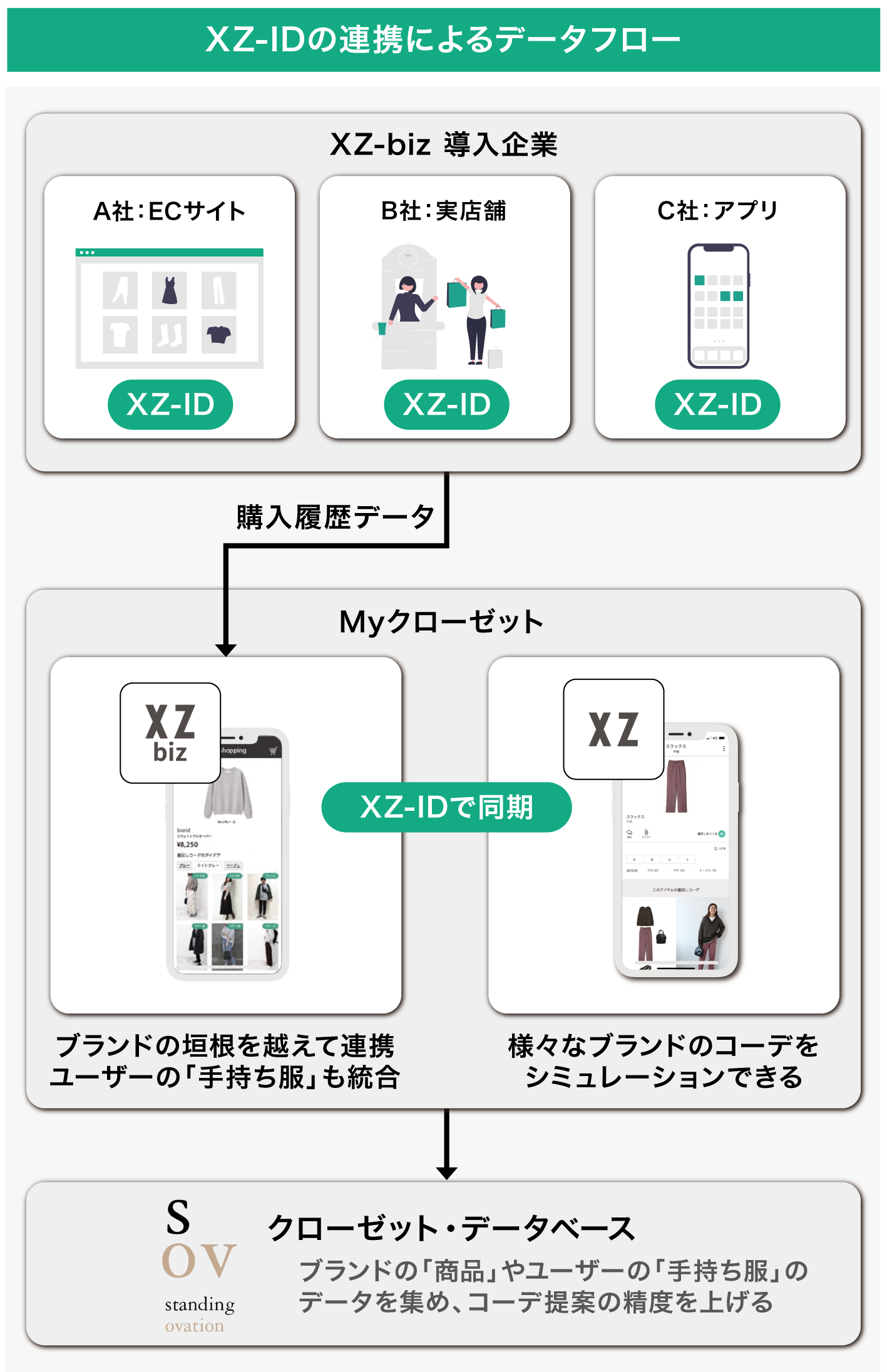 ブランド間の垣根を超えた連携には「XZ-ID(クローゼット・アイディー)」を用い、「XZ」アプリとも連携してユーザー自身が元々持っていた「手持ち服」も統合できるように設計を行っています。これにより、ユーザーが持っているすべてのブランドの手持ち服(ファッションアイテム)を1つのクローゼットに統合でき、各ECサイトやブランド実店舗でも持ち回れるようになると考えています。