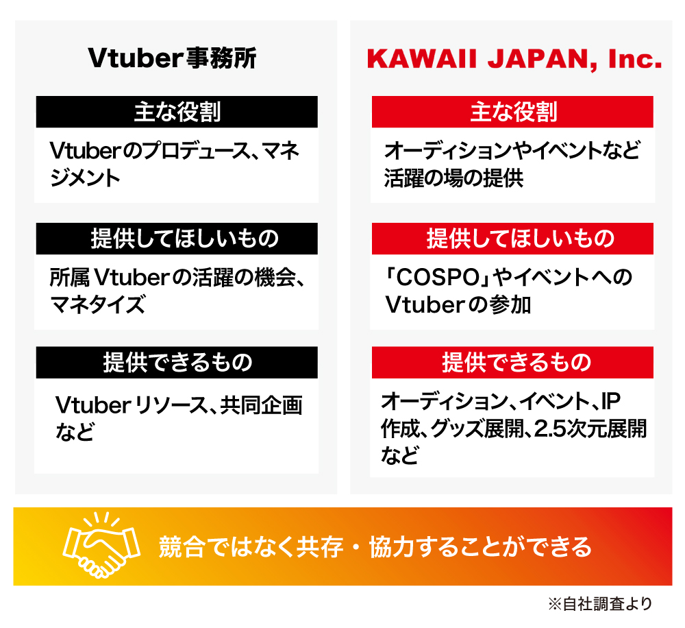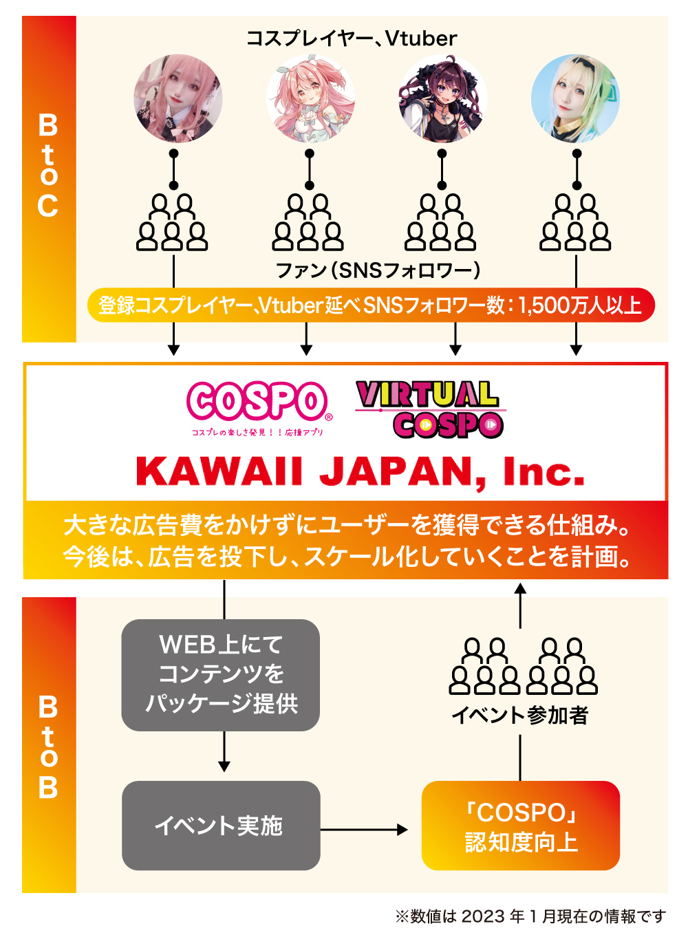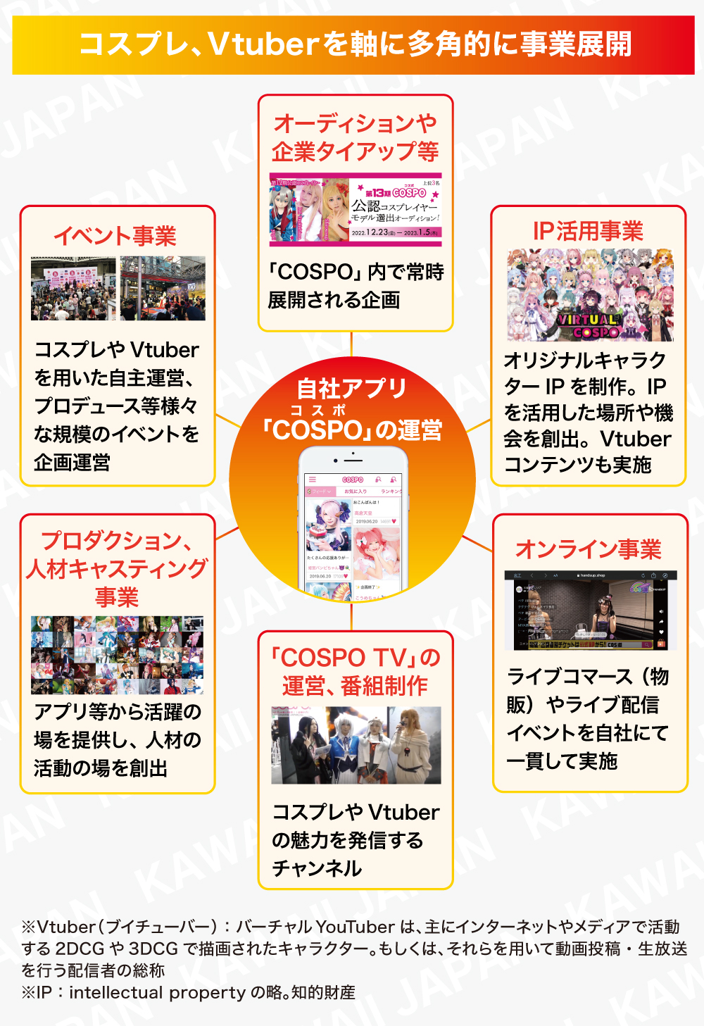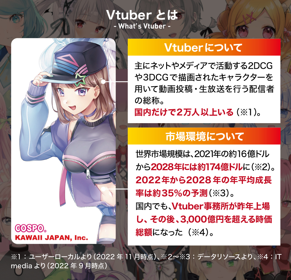 弊社は、創業時から軸として行なってきた「コスプレ」 =「リアル」の文化と、新たに「Vtuber」=「バーチャル」を双方向で日本の「KAWAII(カワイイ)」を世界に発信するグローバルプラットフォームの構築を進めています。「KAWAII」は、今や世界各国で日本のポップカルチャーの代名詞として使われており、日本が世界に誇れる文化として広がっております(弊社調べ)。