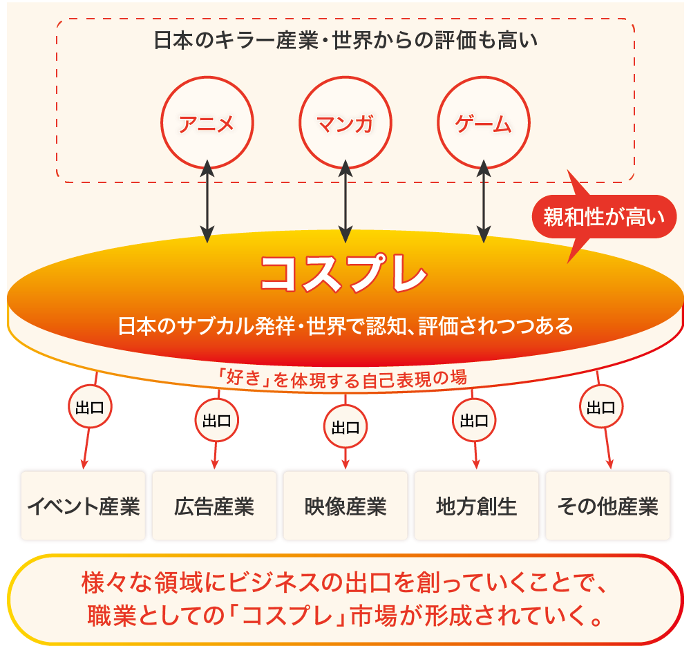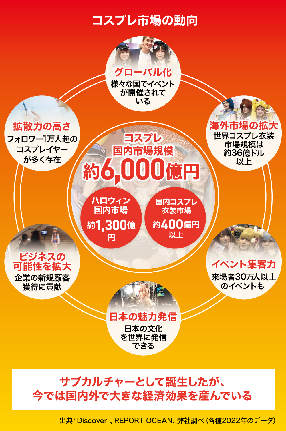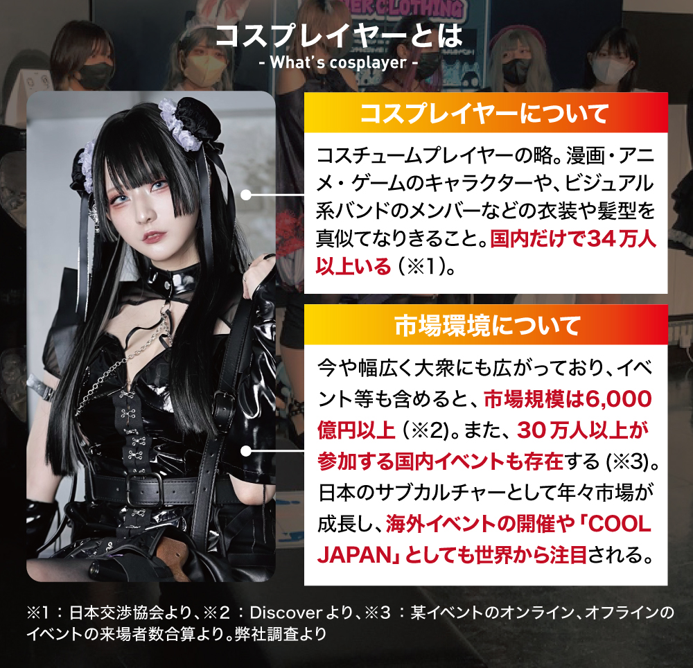 近年、アニメ、漫画、ゲーム市場の盛り上がりと共に、コスプレ市場は大衆にも認知されるカルチャーとして成長しました。また、コスプレに関連したイベントなども近年拡大し、大きな経済効果も産んでいます。