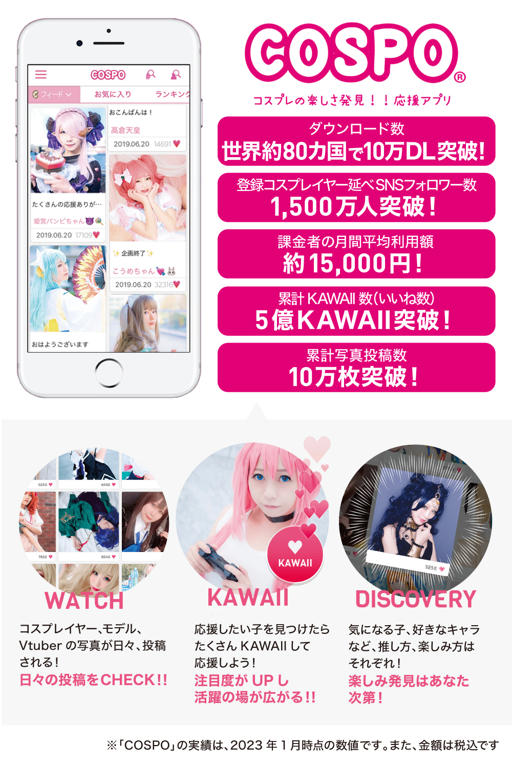 弊社が開発・運営する「COSPO」は、コスプレイヤーやVtuberが写真を投稿し、閲覧者がお気に入りのコスプレイヤーやVtuberを応援できるアプリ・Webサービスです。現在、10万ダウンロードを超え、コスプレイヤーやVtuberの活躍の場の創出や、それらを楽しむ人たちのコミュニティを形成しています。