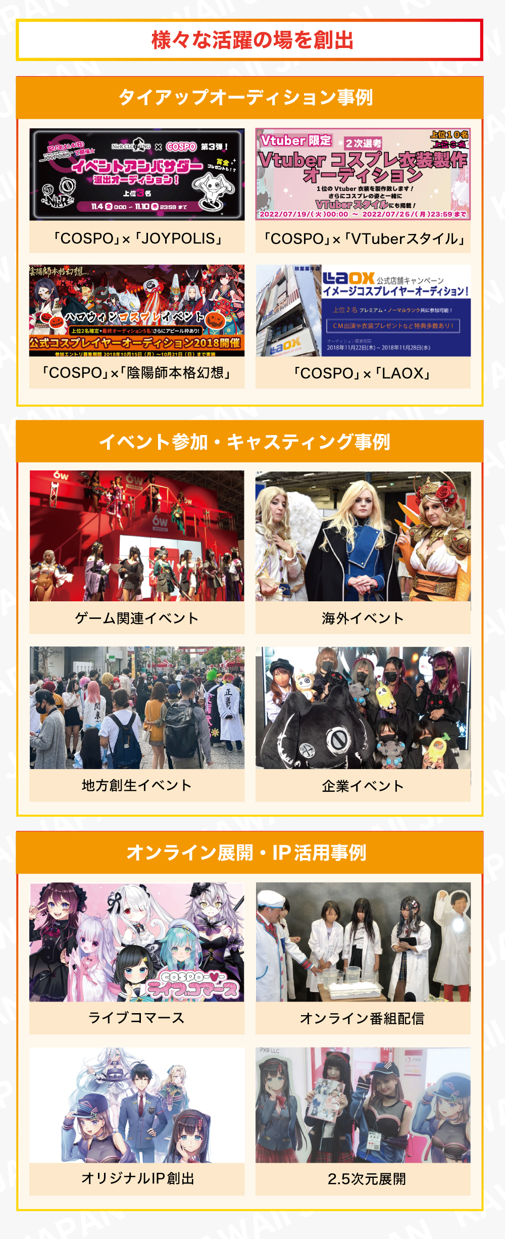 これらの仕組みを通してコスプレイヤーやVtuberの活躍の場を拡大していくことで、これらの活動が“趣味”だけではなく、機会の創出に繋がる“職業”として、そして、ビジネスとして市場が成り立っていくことを目指しています。この様な取り組みが徐々に市場に認められ、コスプレイヤーやVtuberを起用したい企業やイベント、地方自治体など、さまざまな業種とのコラボも拡大しています。