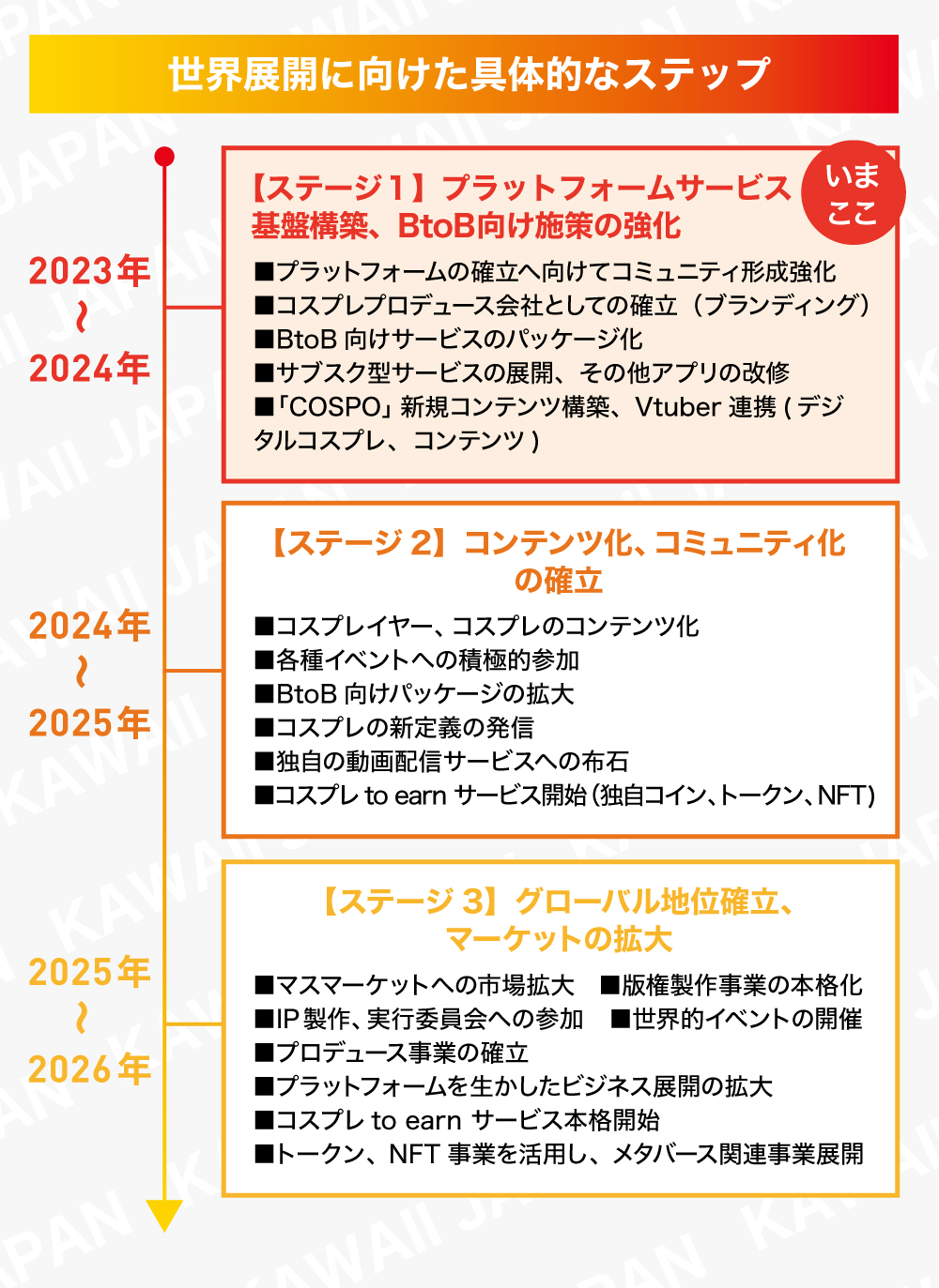 今後は、「COSPO」内におけるUIUX改善やサブスク機能、グッズ販売機能の強化、デジタルグッズのNFT化なども行い、ファンの応援の最大化の仕組みも強化していく予定です。そして、さまざまな業界と連携してコスプレイヤーやVtuberの活躍の場を広げながら、「KAWAII」文化を世界中に発信していくことを目指します。