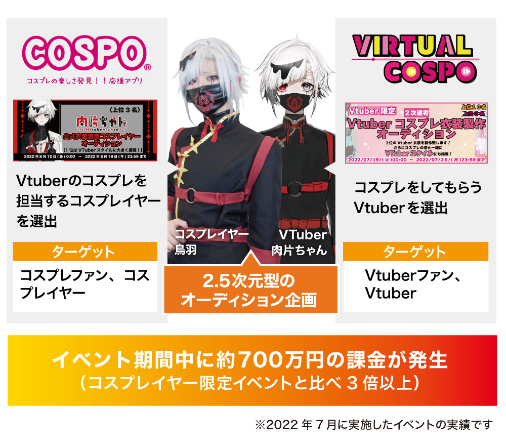 コスプレとVtuberの両方を扱っているため、双方を融合させたシナジー効果が期待できるのも優位点となります。実際に「COSPO」内でVtuberのコスプレ衣装を着るコスプレイヤーのオーディションなども実施されて好評を博しており、このような形であれば既存のVtuberプロダクションとは競合ではなく共存・協力できる関係であると考えています。