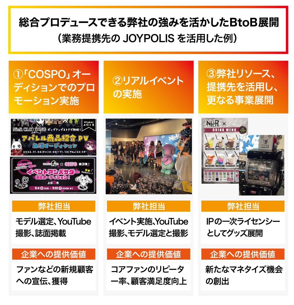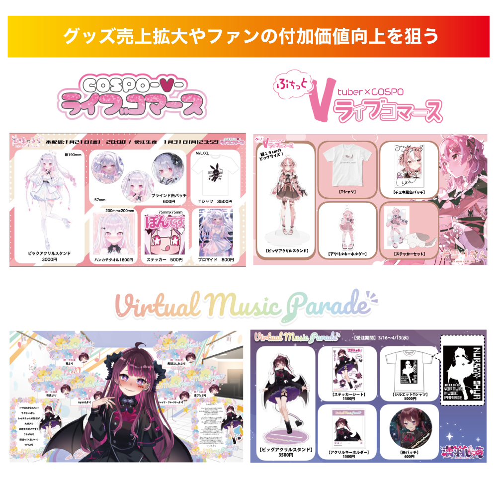 また、「COSPO」内にVtuberを新カテゴリとして本格融合することを計画しています。それにより、「COSPO」の新規参加者及びユーザーを増加し、さらに、Vtuberのオンライン事業も本格稼働させていくことを目指しています。