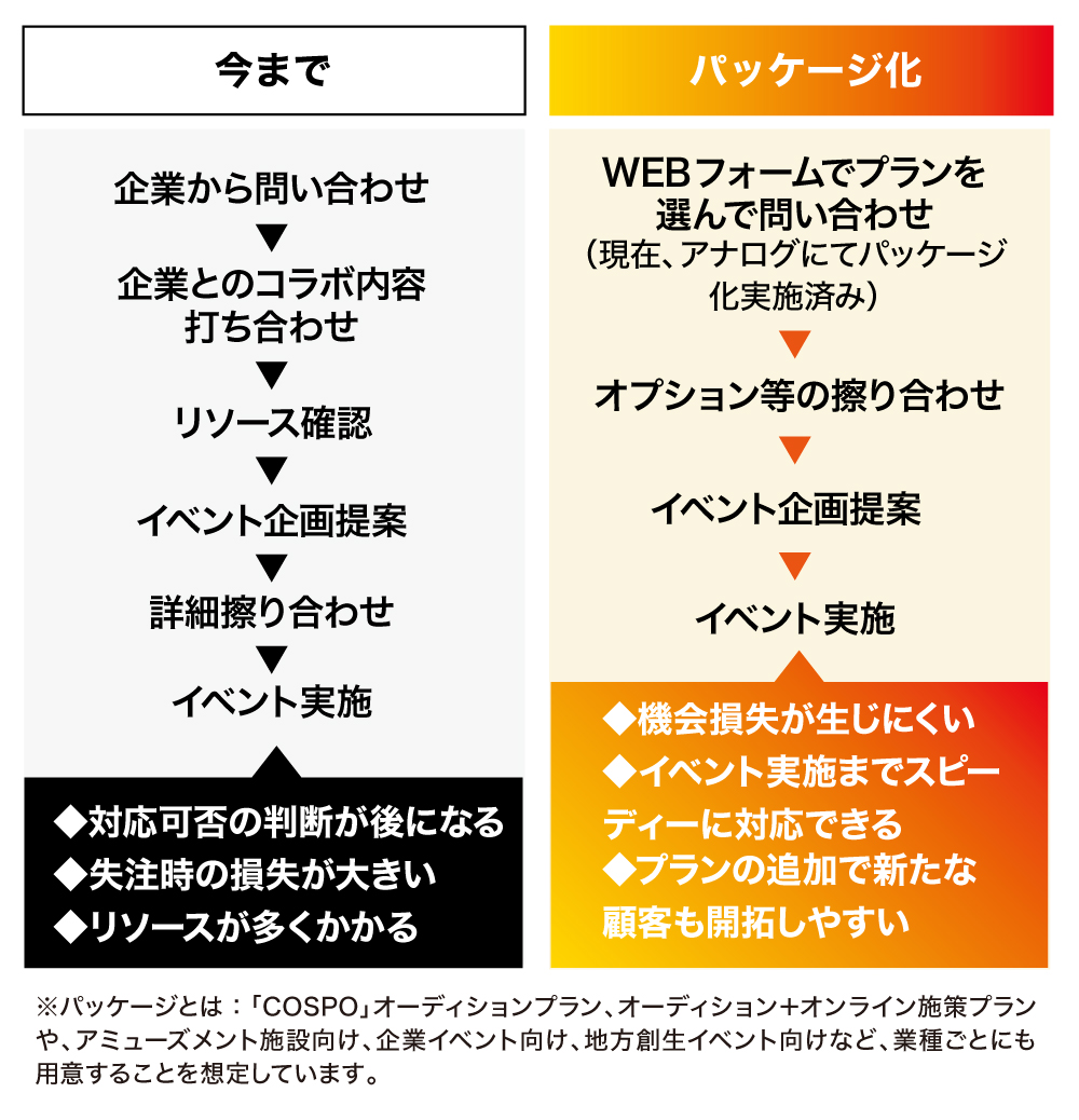 これらの過程をプロジェクトメンバーや業務提携にて組成し、外部委託せずに全て自社内で実施しているので、ノウハウも蓄積され、パッケージプランの提供先企業に対するイベント運営やプロデュースの提案も的確に行えると自負しています。
