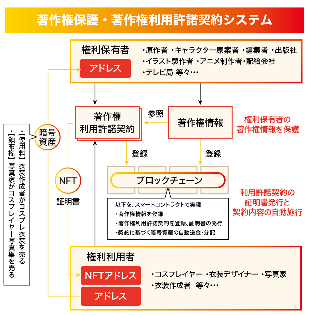ブロックチェーンやNFTを活用し、著作物の利用許諾証明や権利者への利益還元の仕組みを構築する構想があります。