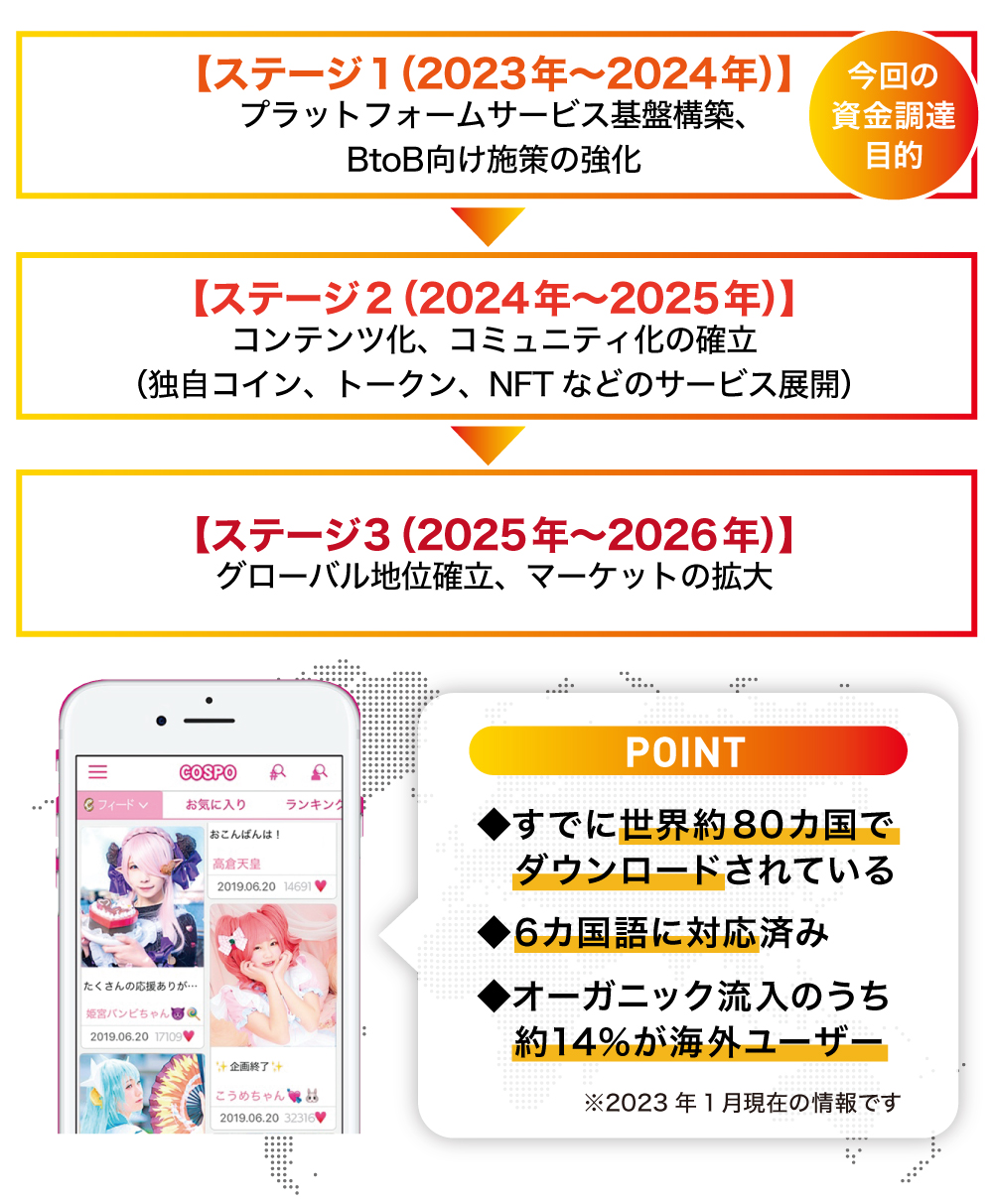 それらが完了する2025年以降を目途に、コロナ禍により一時ストップしていた海外展開の拡大を再開する予定です。すでに、「COSPO」は6カ国語に対応しており、約80カ国でダウンロードされ、オーガニック流入のうち約14%が海外からで、アメリカを筆頭にヨーロッパ、ベトナム、中国、台湾などで特に人気です。