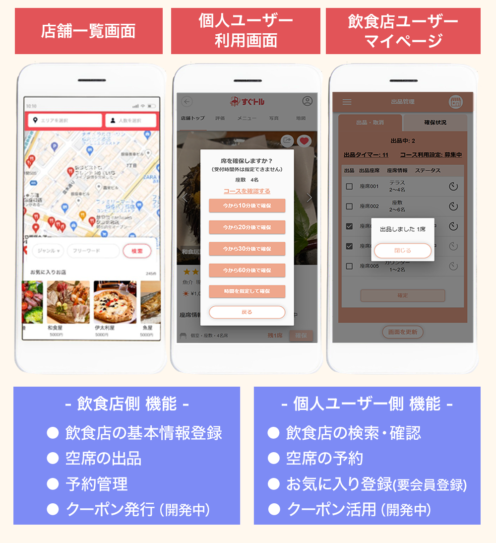 個人ユーザー側は、エリアや人数などの条件を指定して飲食店を検索し、「今空いている席のリスト」から希望の飲食店が見つかればそのまま予約ができます。