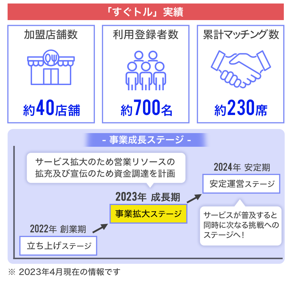 2022年7月からサービスを開始し、2023年4月20日現在、新橋・銀座・有楽町エリアを中心にしたドミナント戦略(地域を絞って集中的に展開する経営戦略)により、加盟店舗約40店、登録者約700名、累計約230席のマッチングを実現しています。